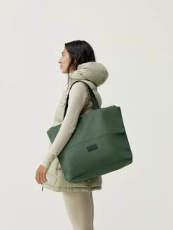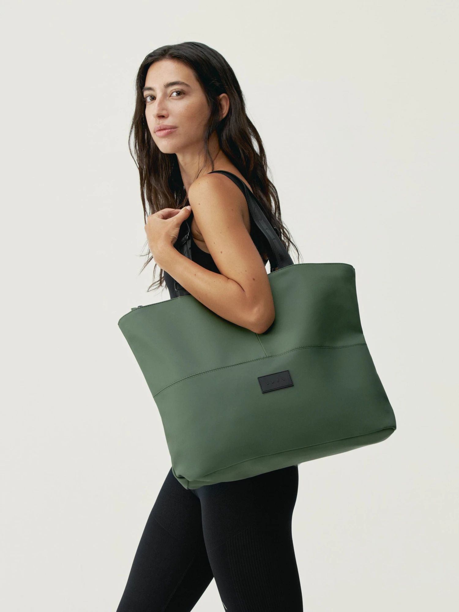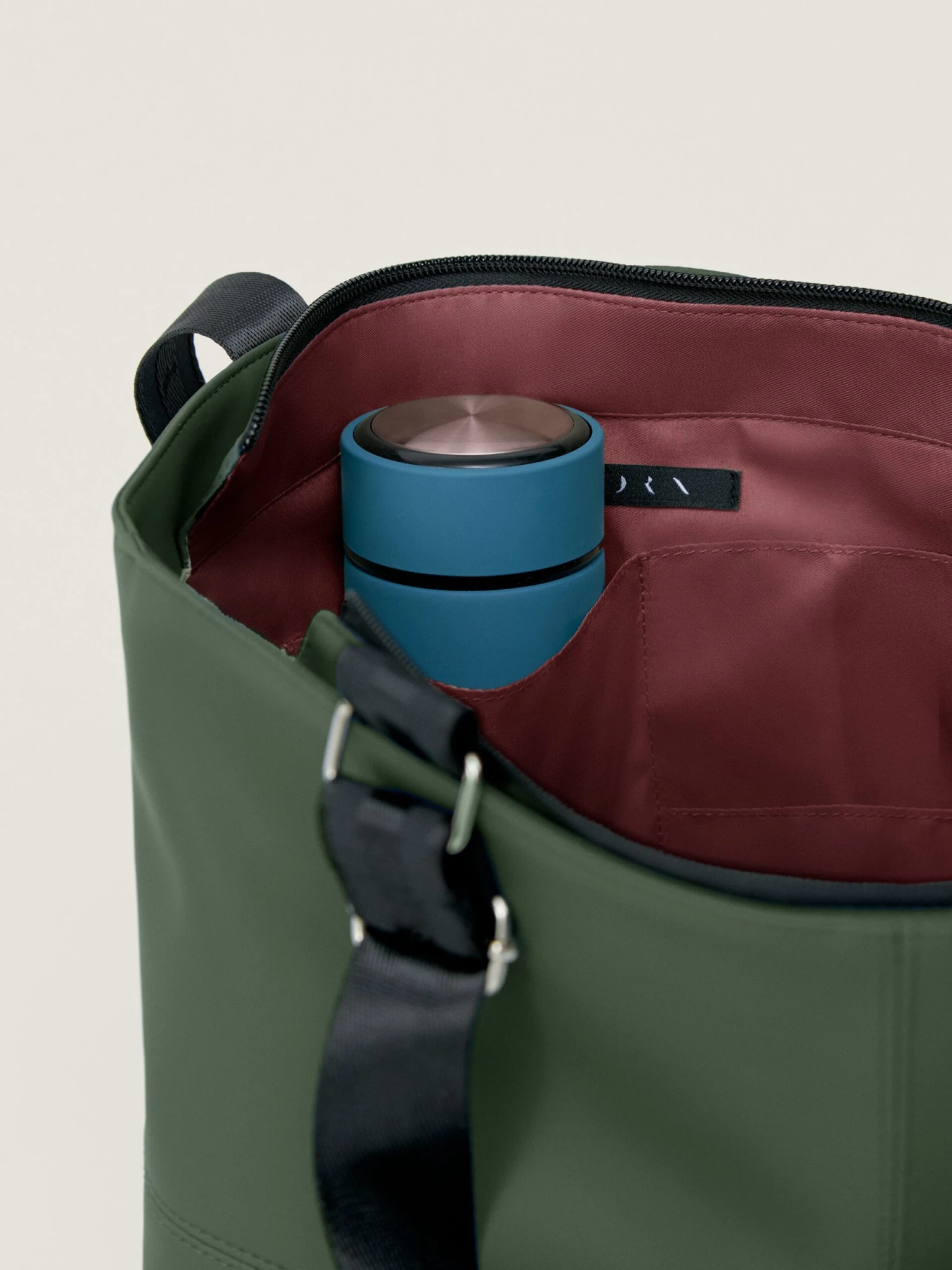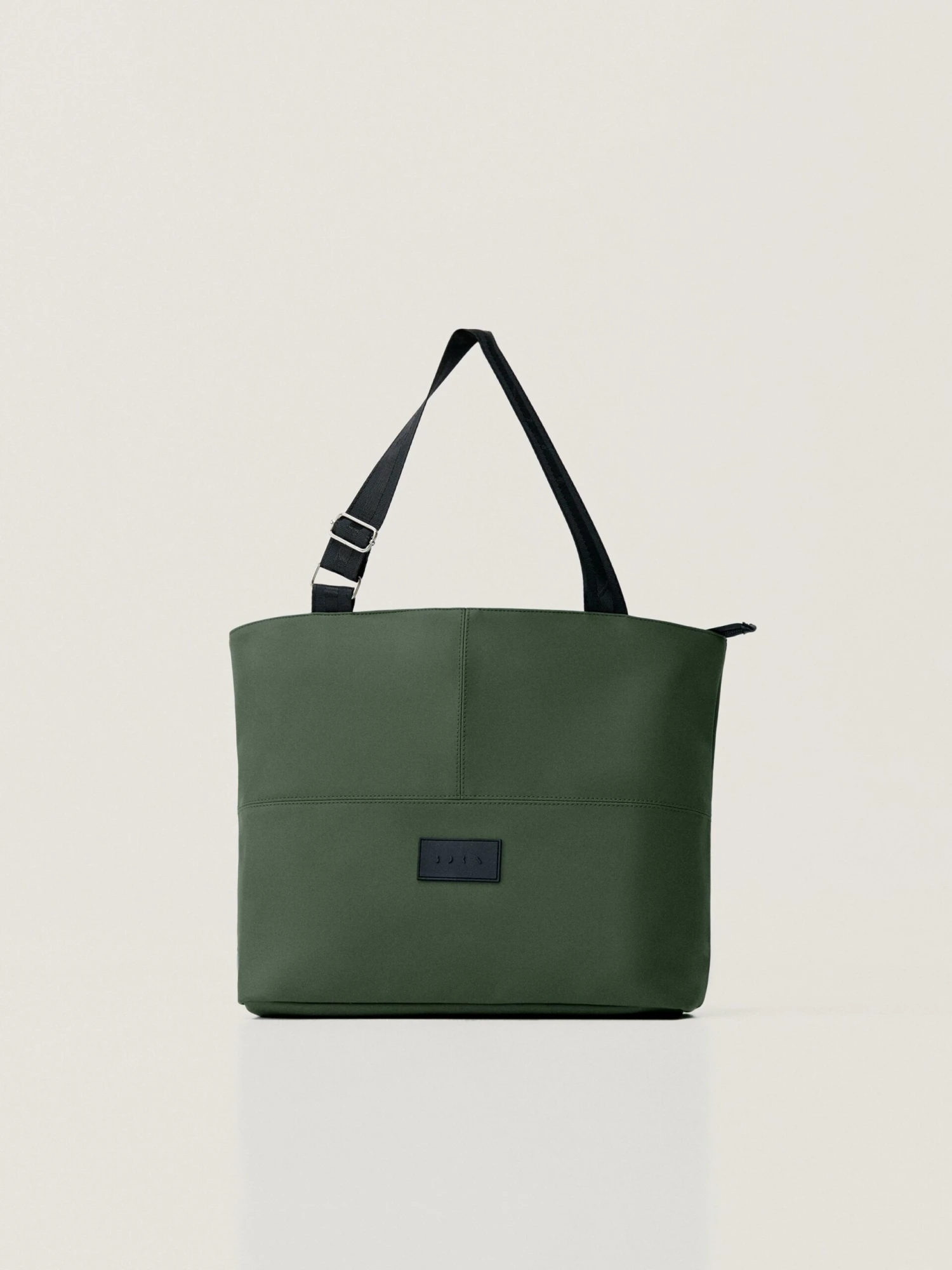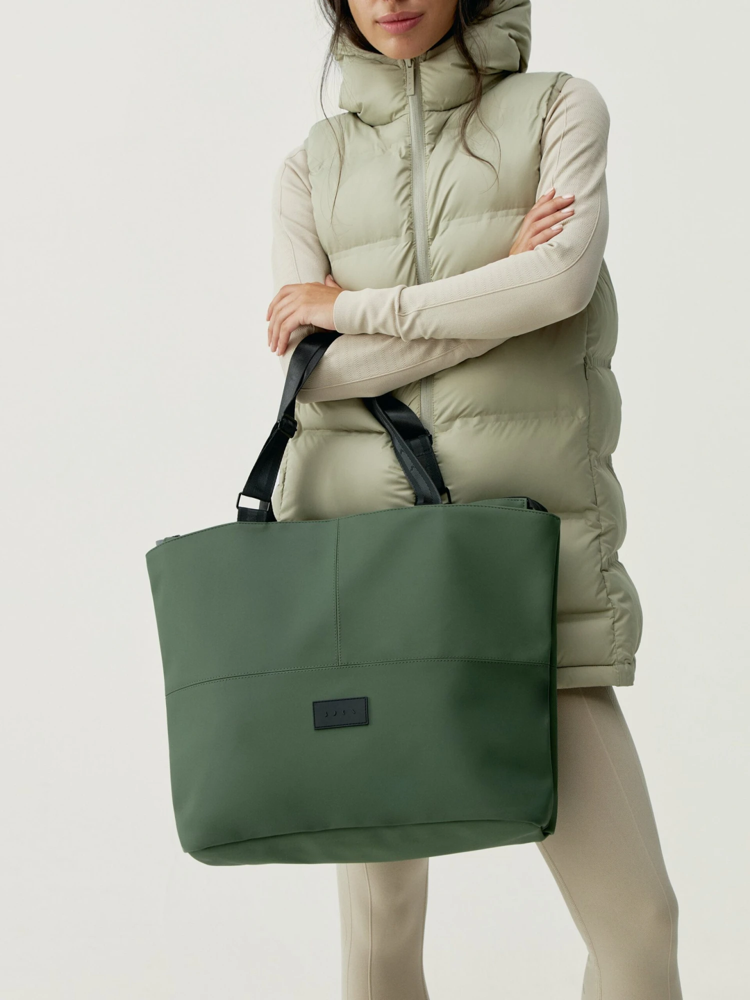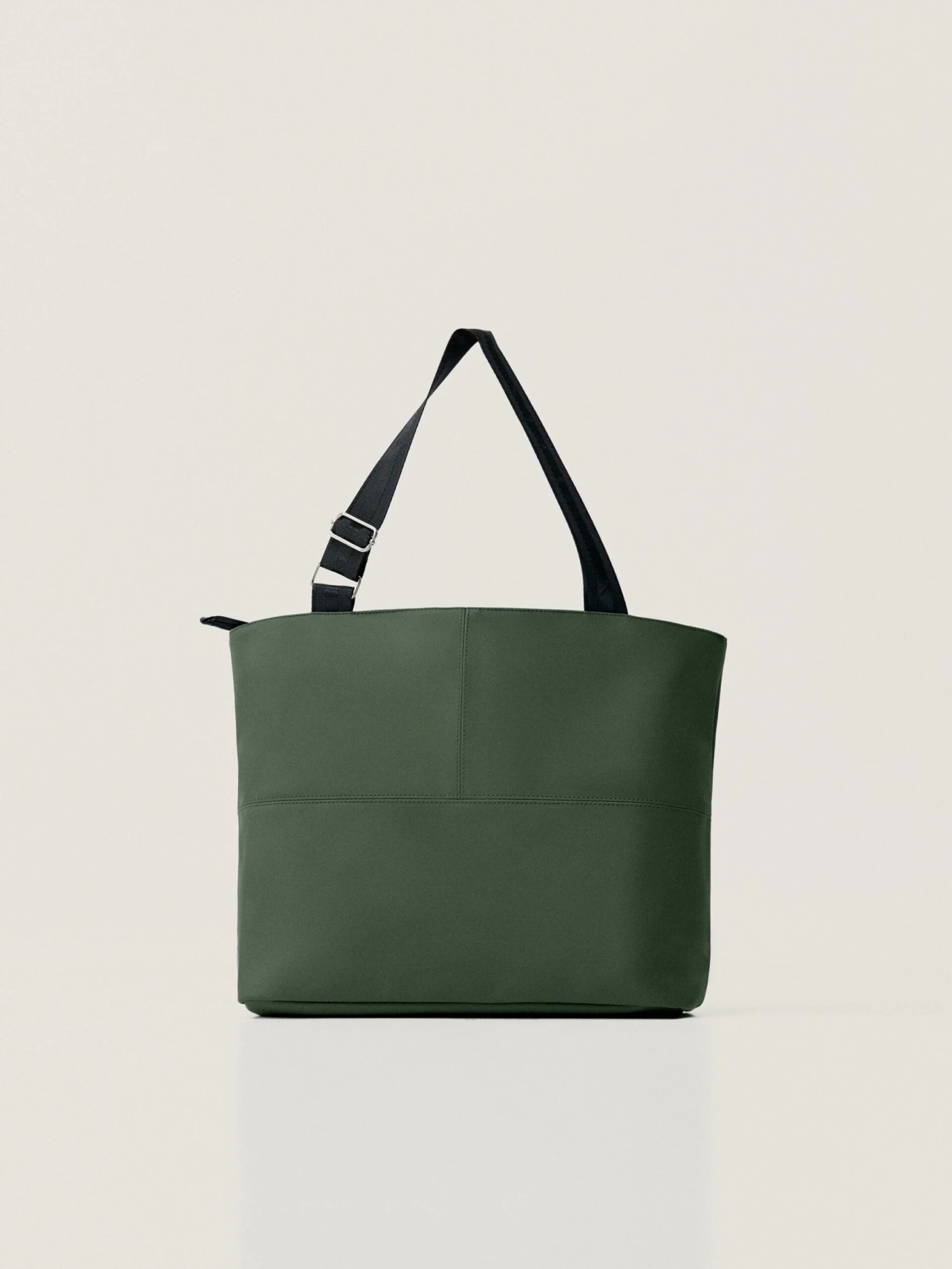 Bolso formato shopper waterproof con cierre de cremallera. Asa regulable, interior a contraste con triple bolsillo interior.