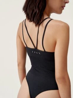 Body versátil de sujeción media. Realizado con tecnología 3D. Uso deportivo perfecto para combinar con legging y conseguir un efecto “mono” y uso casual para combinar con cualquier prenda. Rib en cintura para adaptarse al cuerpo, patrón tanga. Tejido “Air_Feel” efecto segunda piel.
