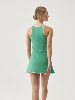 Vestido pádel-tenis deportivo con sujetador incorporado de sujeción media-alta. Tejido “Skin_move”. Viveado a contraste de inspiración “retro” con abertura lateral para un mejor acceso a la bola.