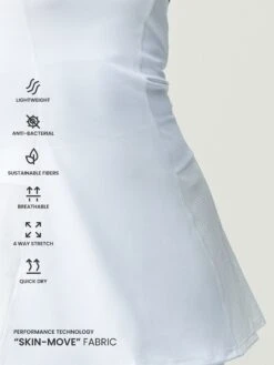 Vestido con sujetador incorporado con sujeción media alta. Diseñado para deportes de raqueta; padel-tenis. Tejido “Skin_Move”. Espalda atlética y piezas de mesh en el lateral para favorecer la transpirabilidad.