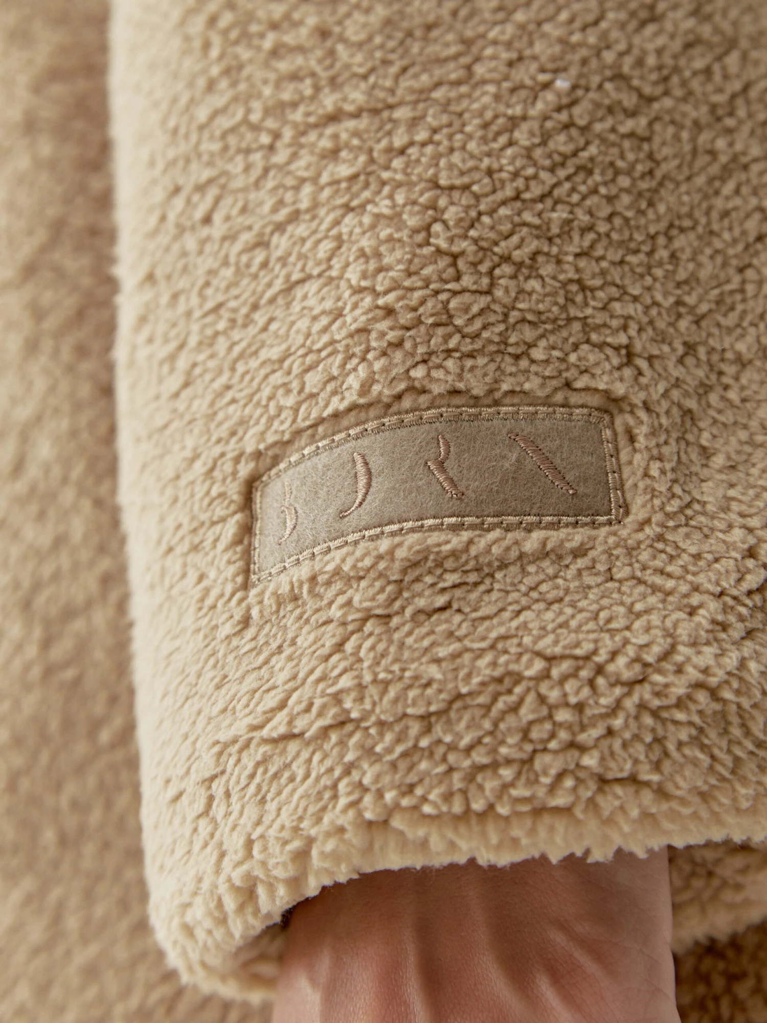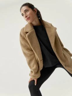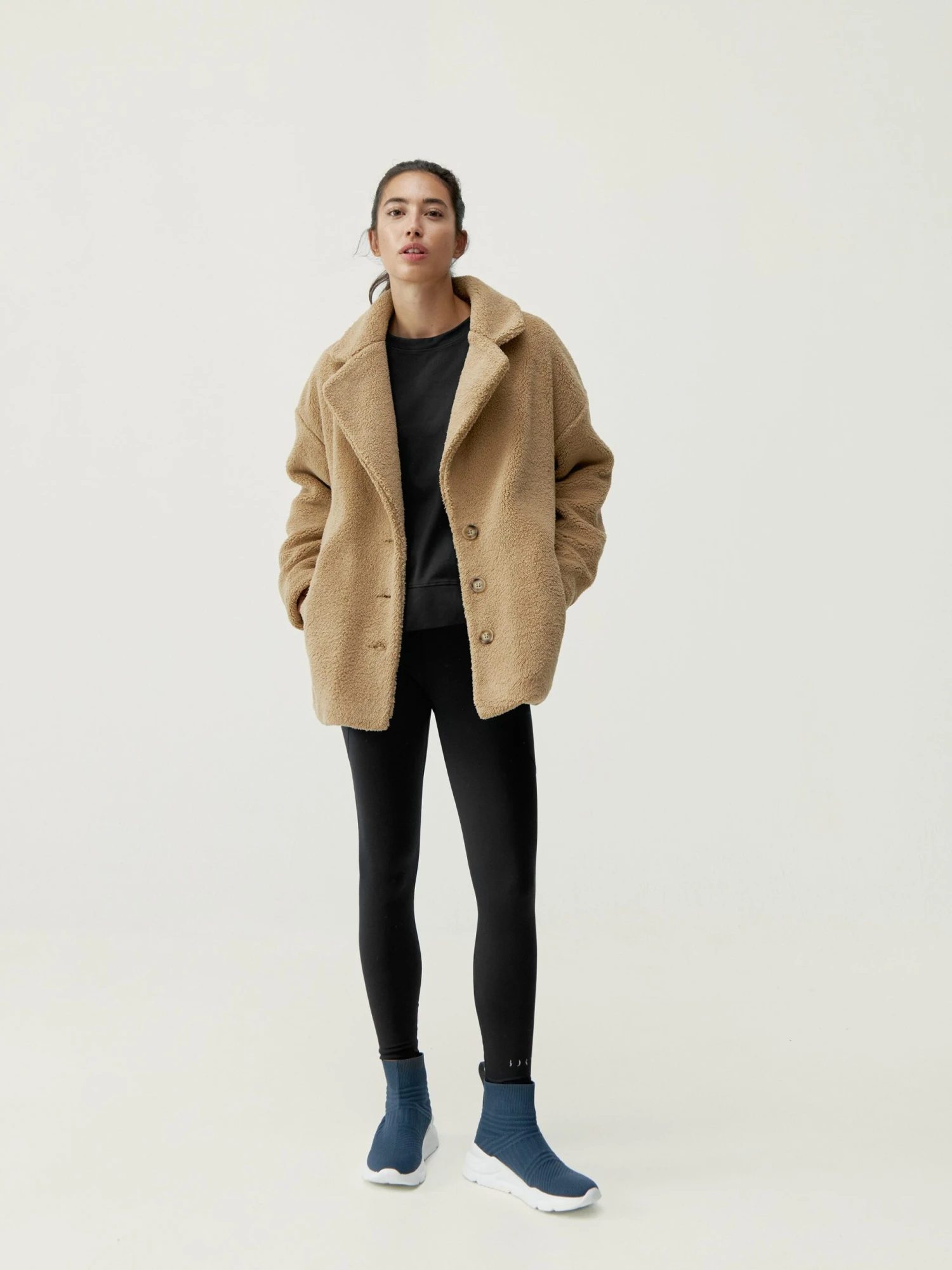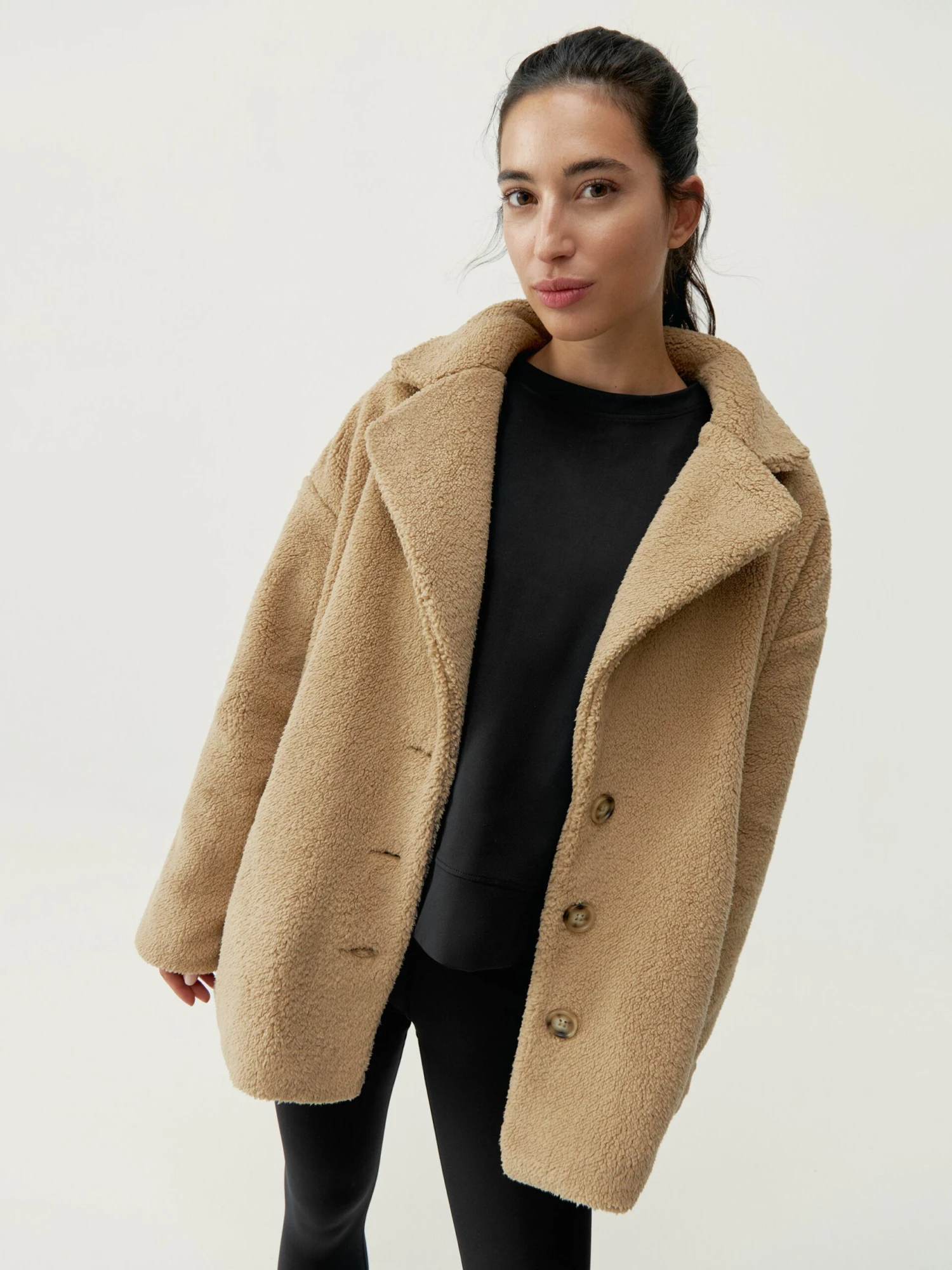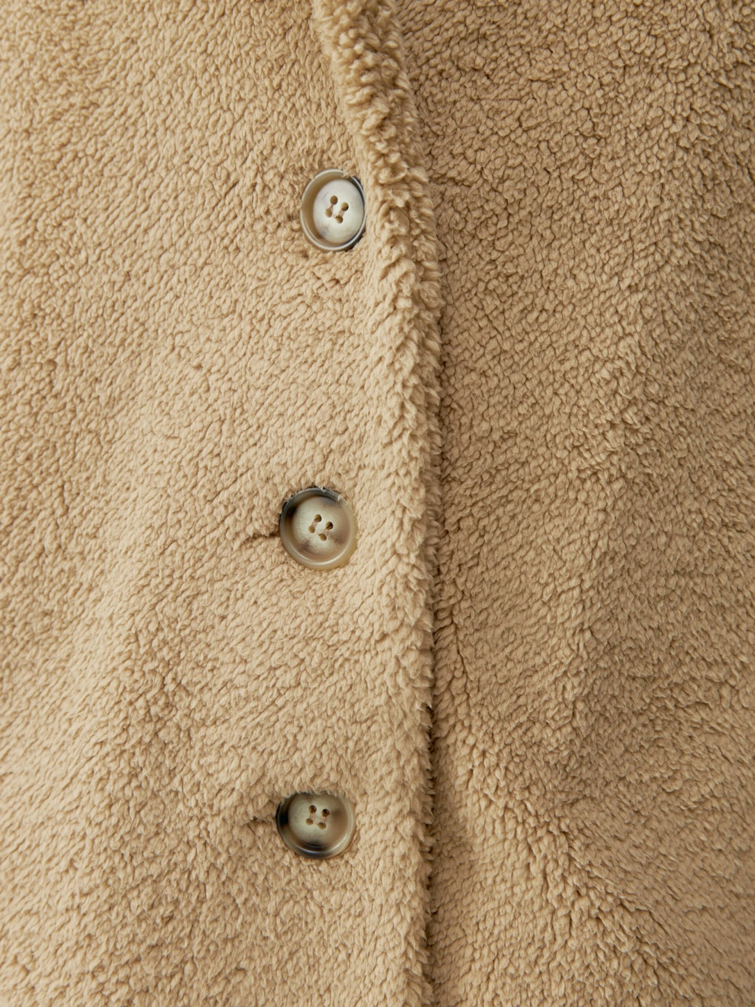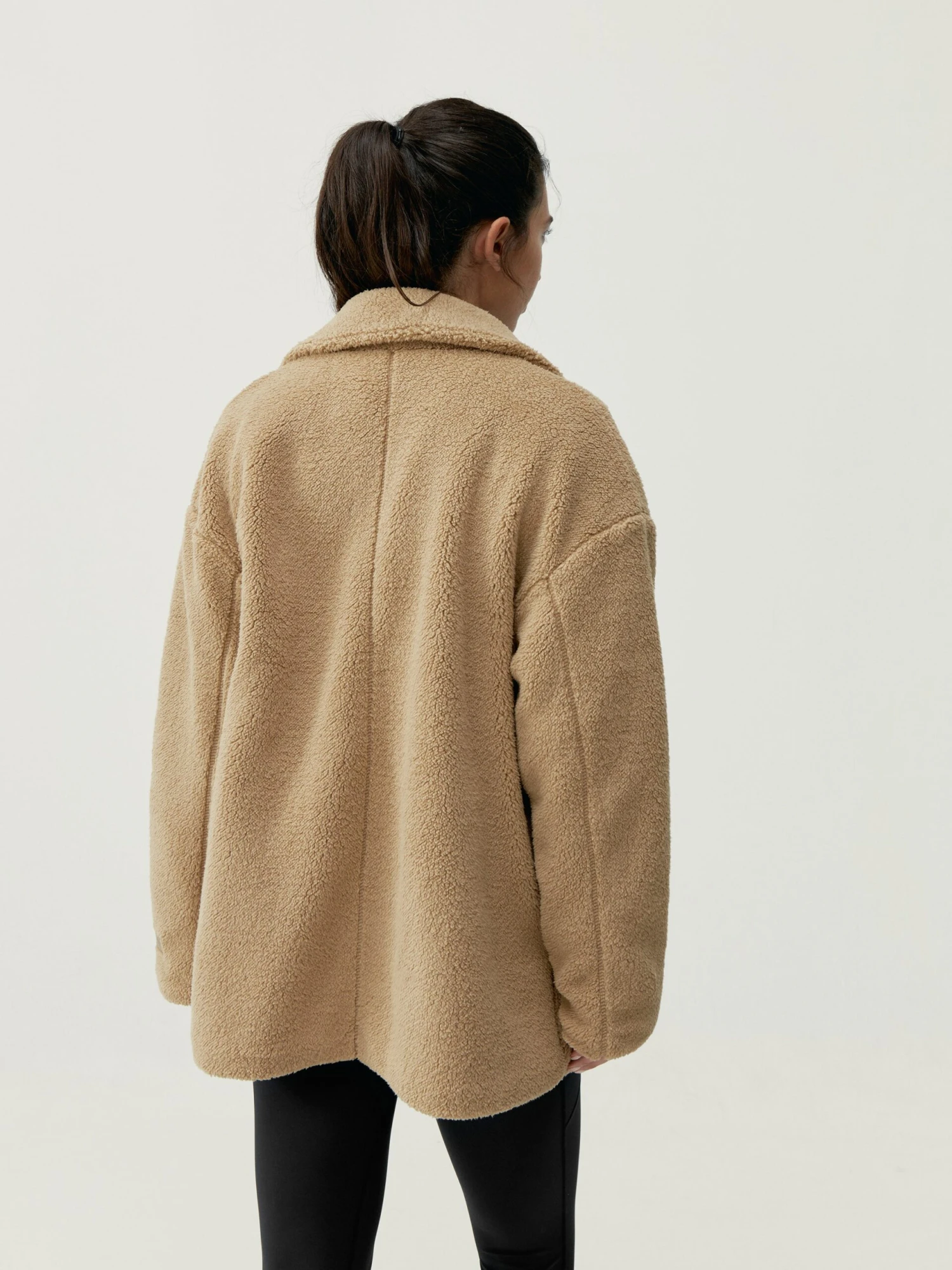 Chaqueta casual con patr贸n oversize. Tejido borreguillo con bolsillo interior y forro polar warm. Cierre con botones.