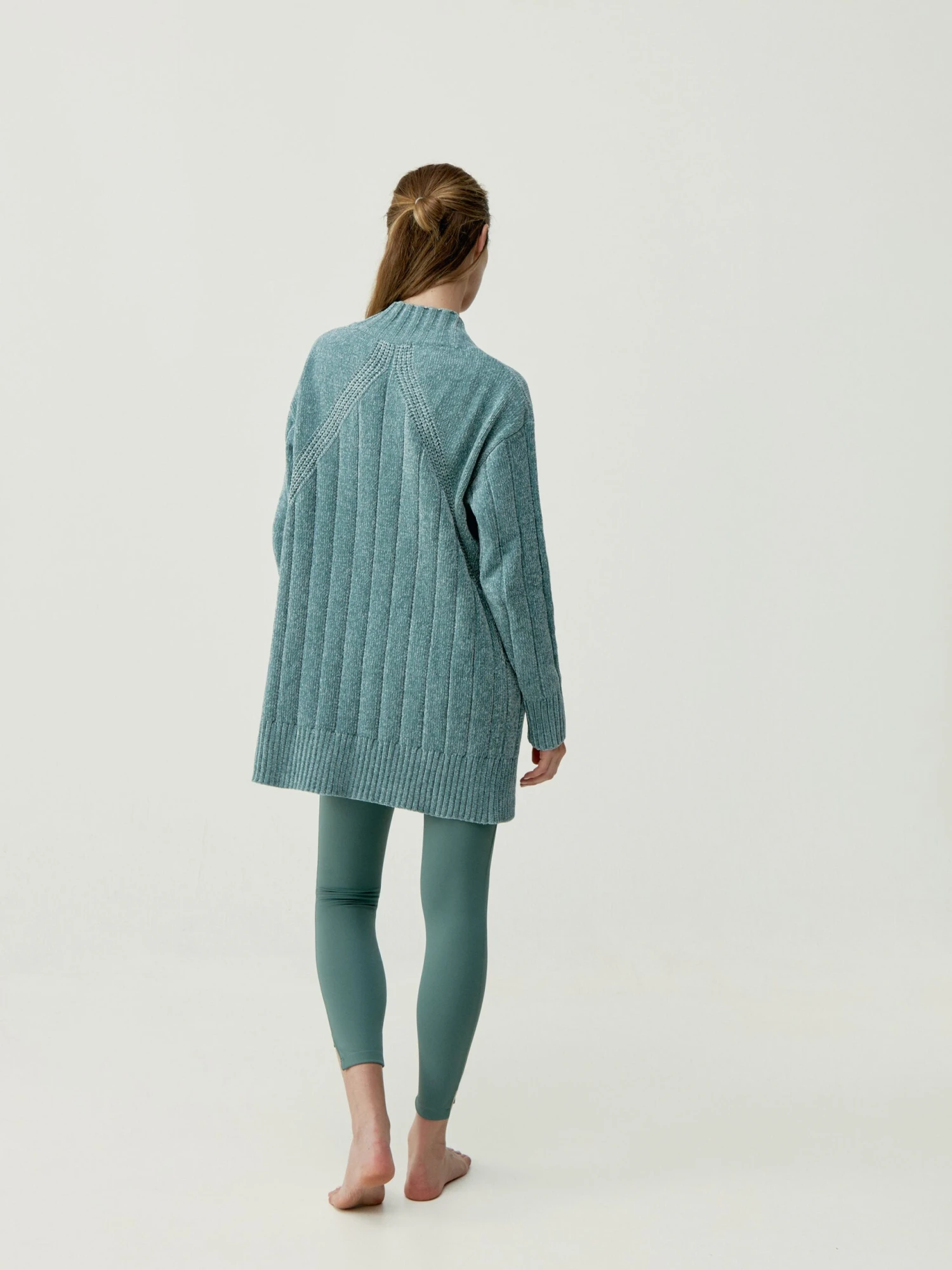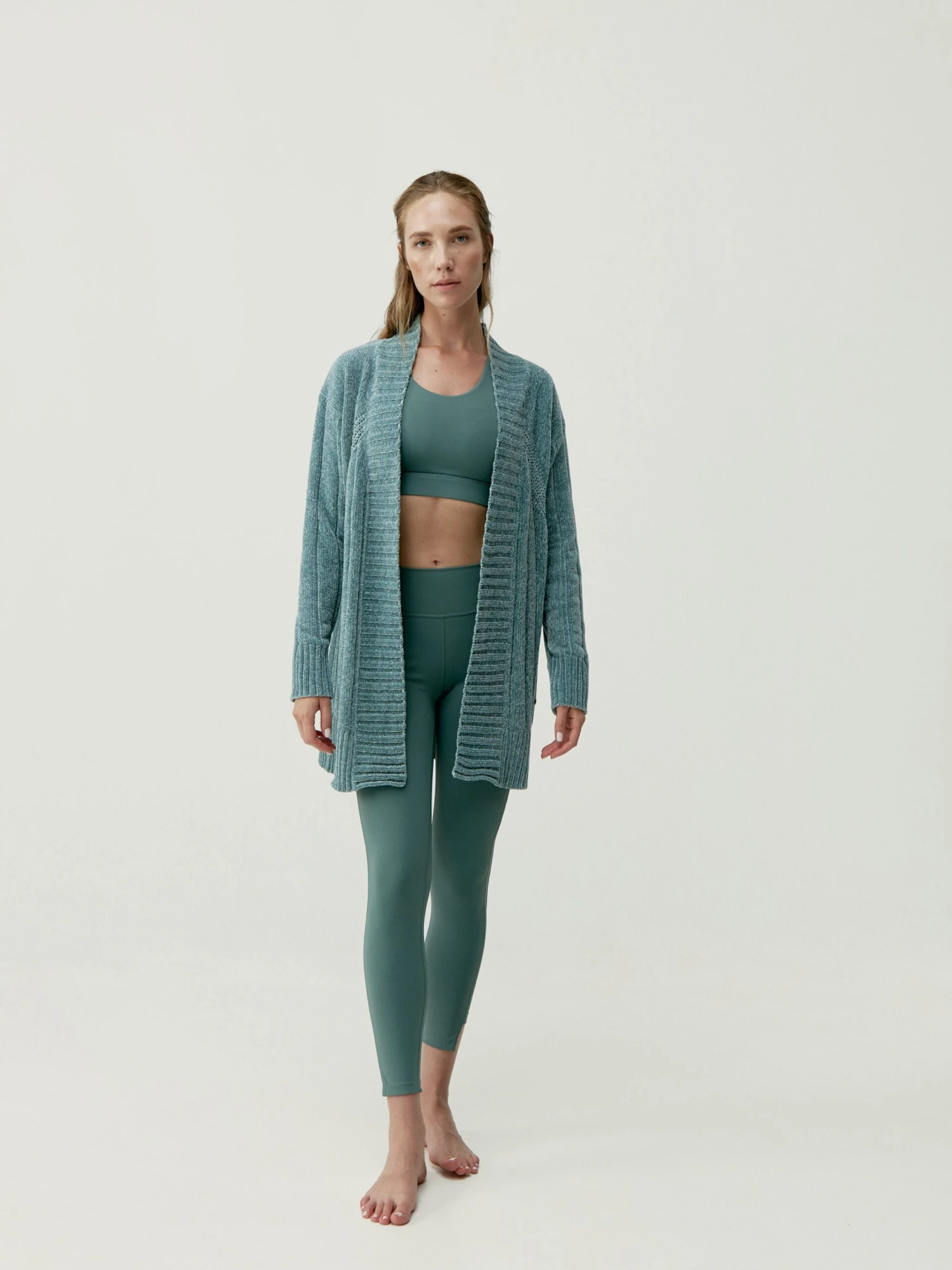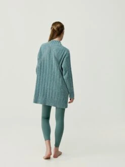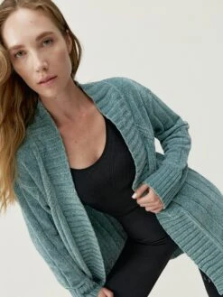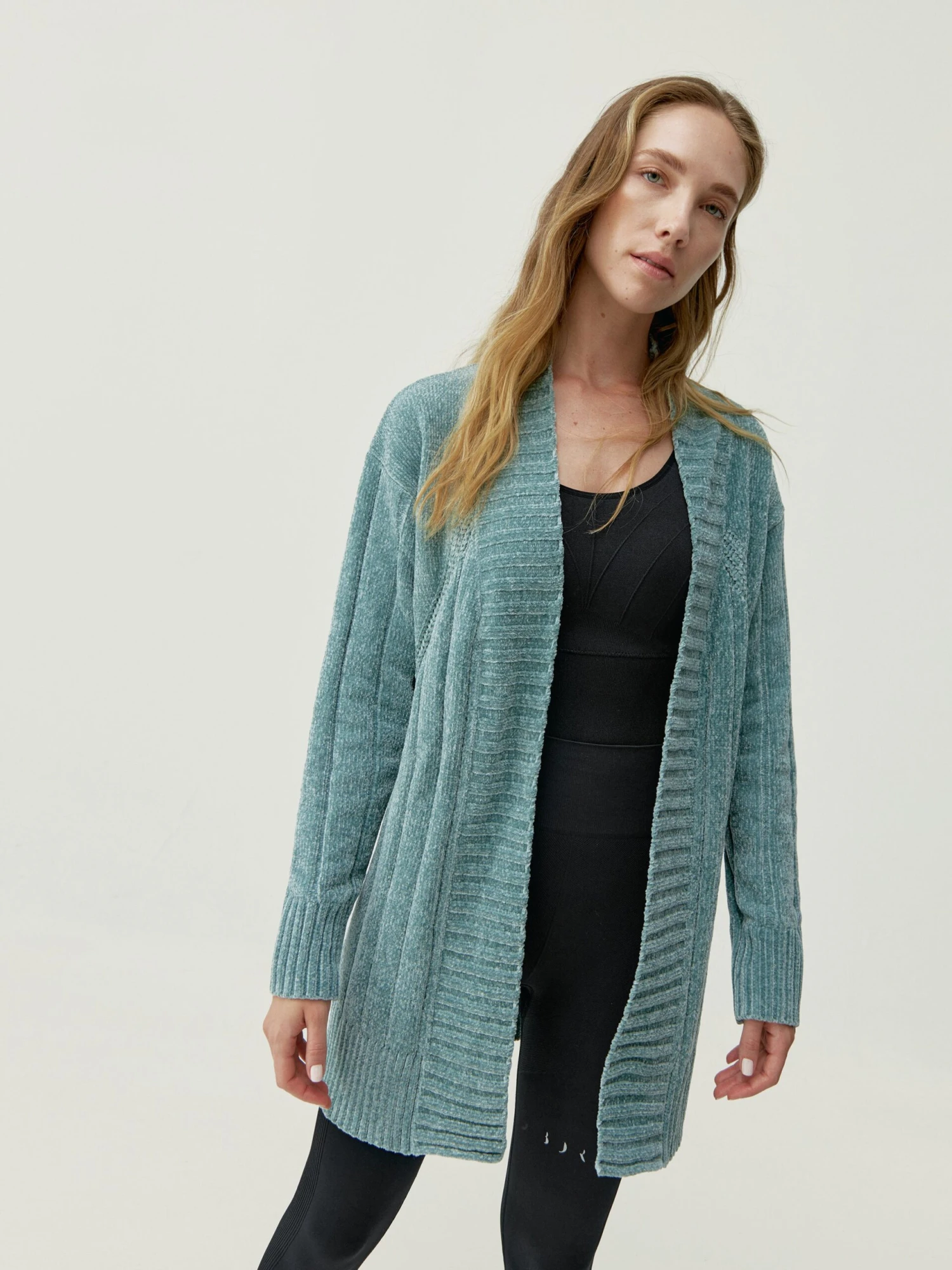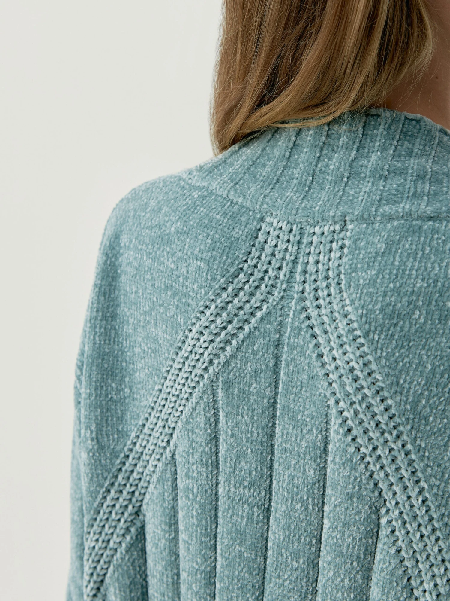 Chaqueta de chenilla sin botones con patr贸n oversize. Detalle decorativo cambio de punto canes煤. Cuerpo canal茅.