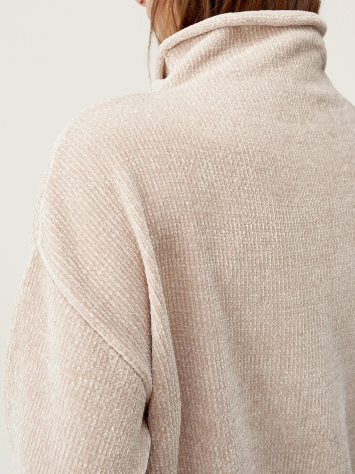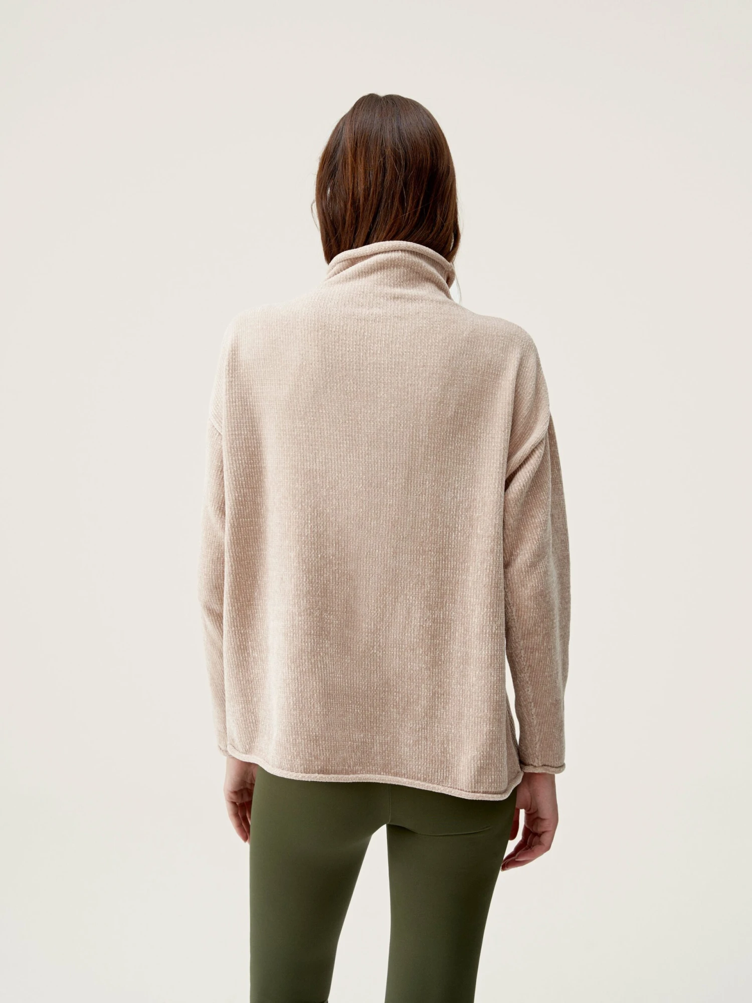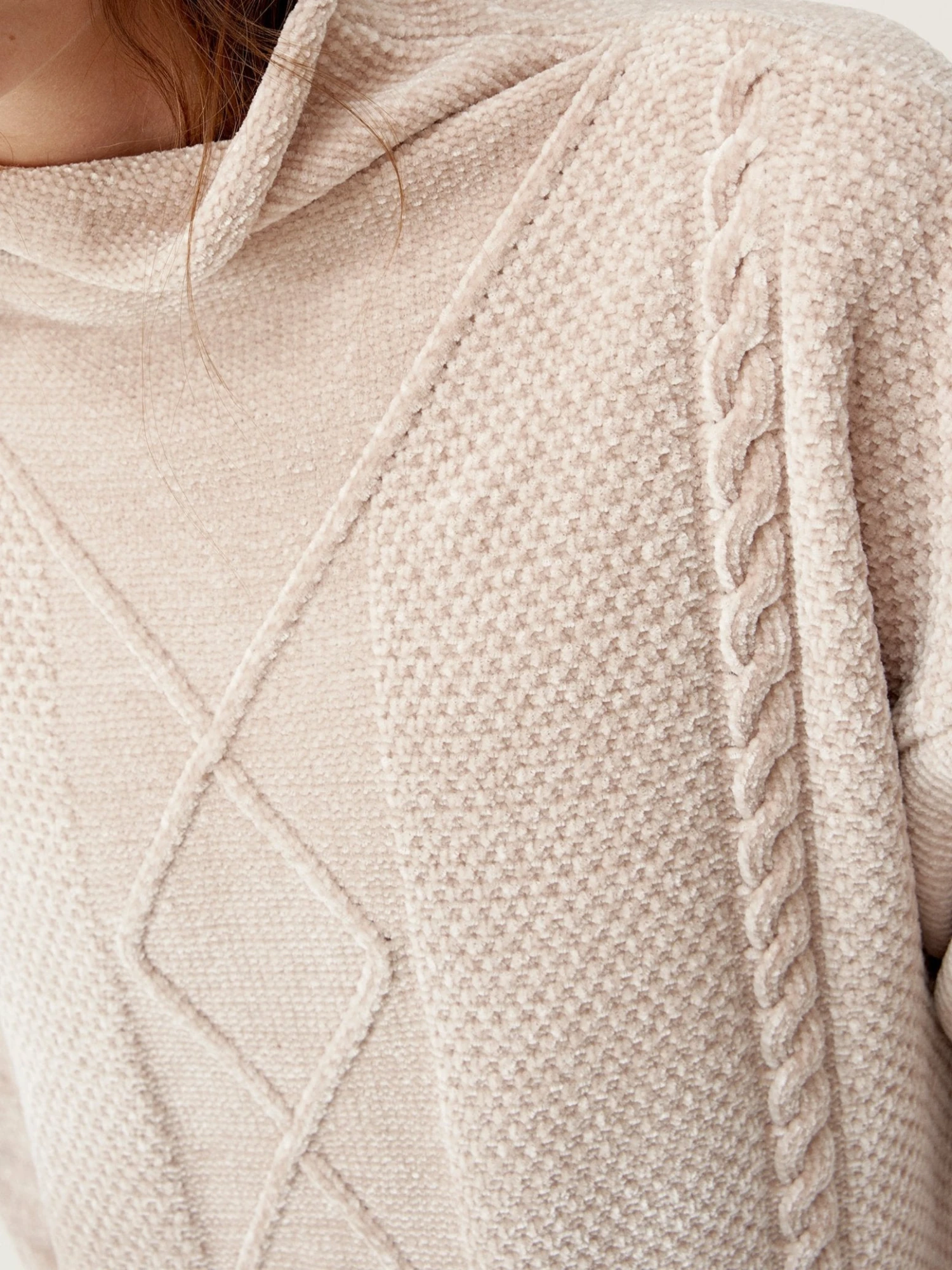 Jersey extra suave de patr贸n oversize, con cuello amplio. Motivos de ochos y cables. Muy vers谩til para combinar con tus Leggings o cualquier otra prenda.