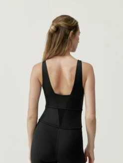 Mono largo capri, con sujetador incorporado y efecto moldeador. Push up integrado y cintura doble ajustada. Escote “V” y espalda en “V” .Tejido premium combinado con mesh en espalda y piernas que conforman un diseño único. Doble vivo aplicado en la parte frontal efecto top.