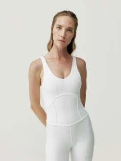Mono largo capri, con sujetador incorporado y efecto moldeador. Push up integrado y cintura doble ajustada. Escote “V” y espalda en “V” .Tejido premium combinado con mesh en espalda y piernas que conforman un diseño único. Doble vivo aplicado en la parte frontal efecto top.