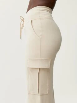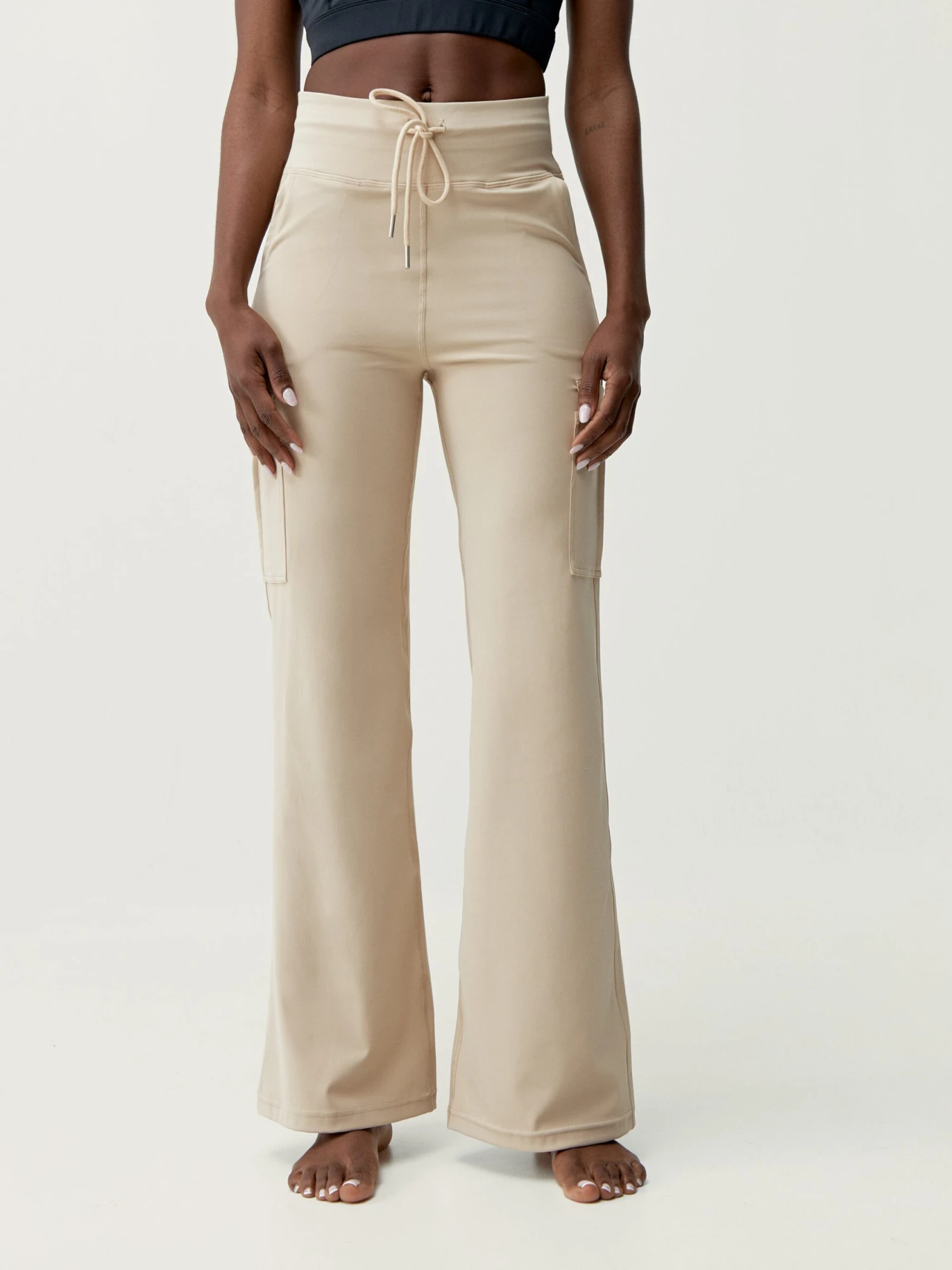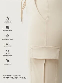 Pantalón ancho con bolsillos cargo laterales. De estilo casual – street. Tejido “Skin_Move”. Cintura alta muy confortable con cordón para regular la medida.