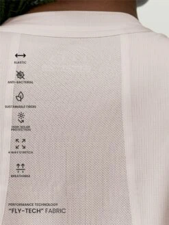 Camiseta técnica. Tejido “Fly_Tech” ligero de secado rápido. Costuras termoselladas. Pieza de mesh en la espalda para favorecer la transpirabilidad de la prenda. Aberturas en el bajo y manga corta.