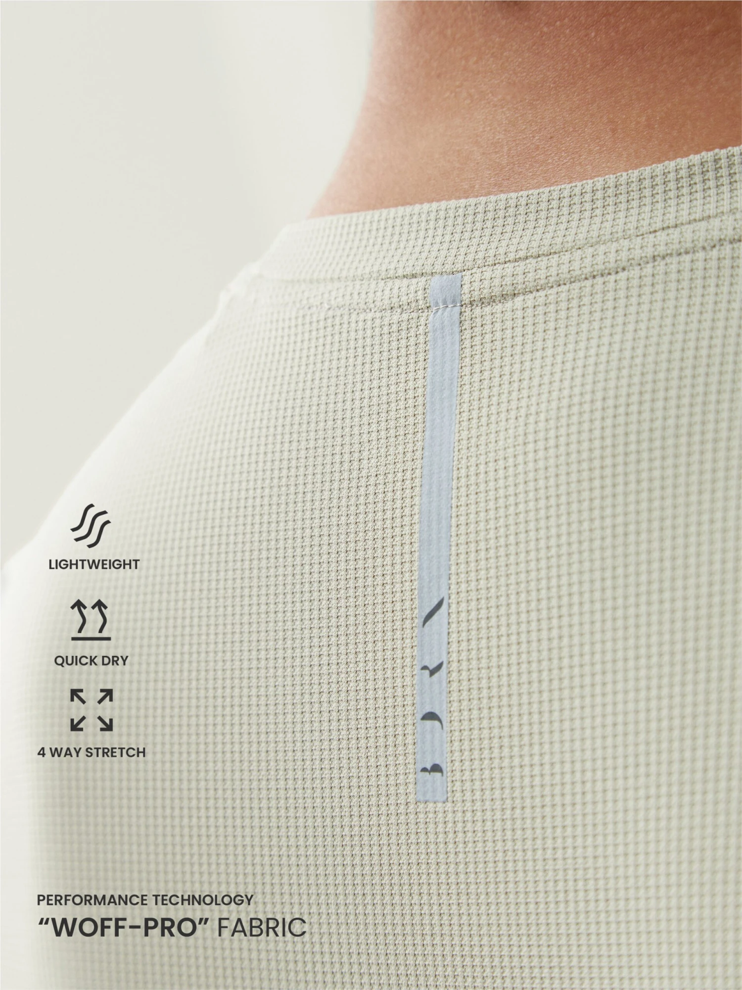 Camiseta técnica manga corta. Tejido “Woff_Pro” ligero, elástico y confortable, para llegar a todos tus movimientos. Con textura “gofrada” para proporcionar mayor transpirabilidad. Espalda ligeramente más larga y aberturas laterales. Cuenta con un print reflectante en la parte trasera.