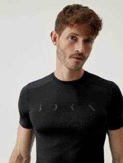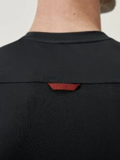 Camiseta técnica manga corta. Combinando tejido “Cool_T” ligero, elástico y confortable con tejido “Woff_PRO”. Cuenta con una cinta en la parte trasera para colgar.