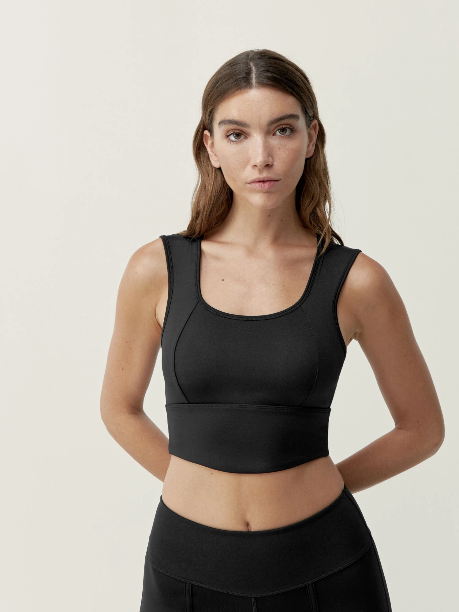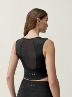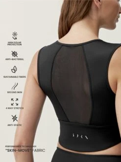 Crop top con un diseño sobrio y muy elegante, espalda con pieza de mesh. Sujeción media – alta. Tejido “Skin_Move”.
