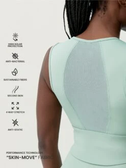 Crop top con un diseño sobrio y muy elegante, espalda con pieza de mesh. Sujeción media – alta. Tejido “Skin_Move”.