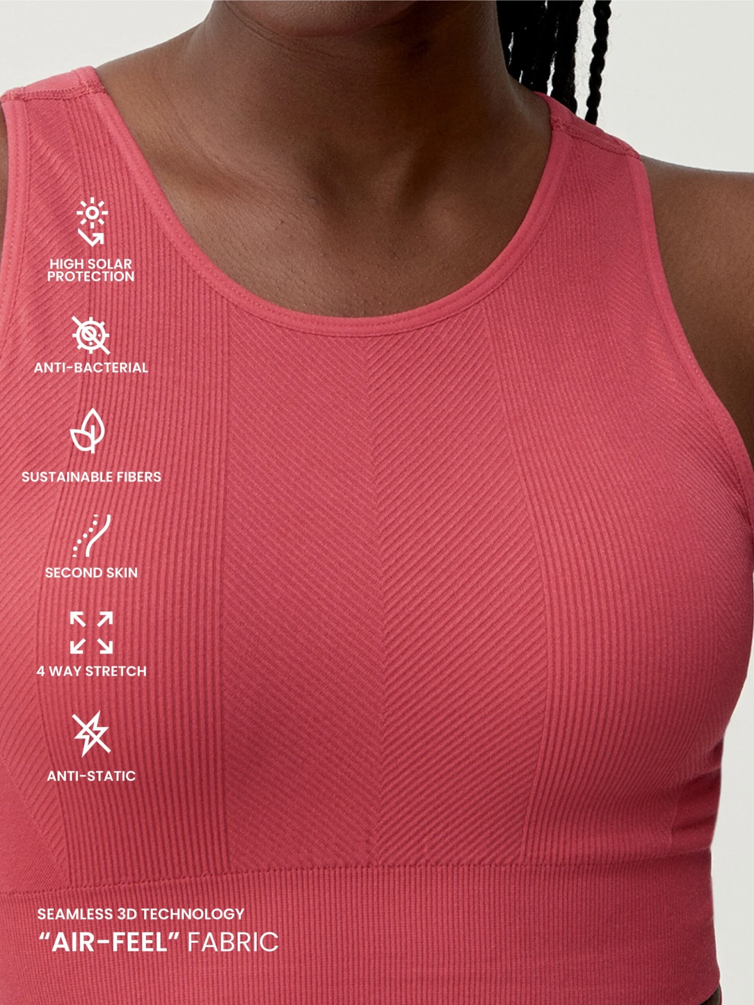 Sujetador cropped deportivo de sujeción media – alta. Tejido “Air_Feel” con tecnología 3D. Diseño con cambios de punto en el tejido para una mayor adaptación al cuerpo.