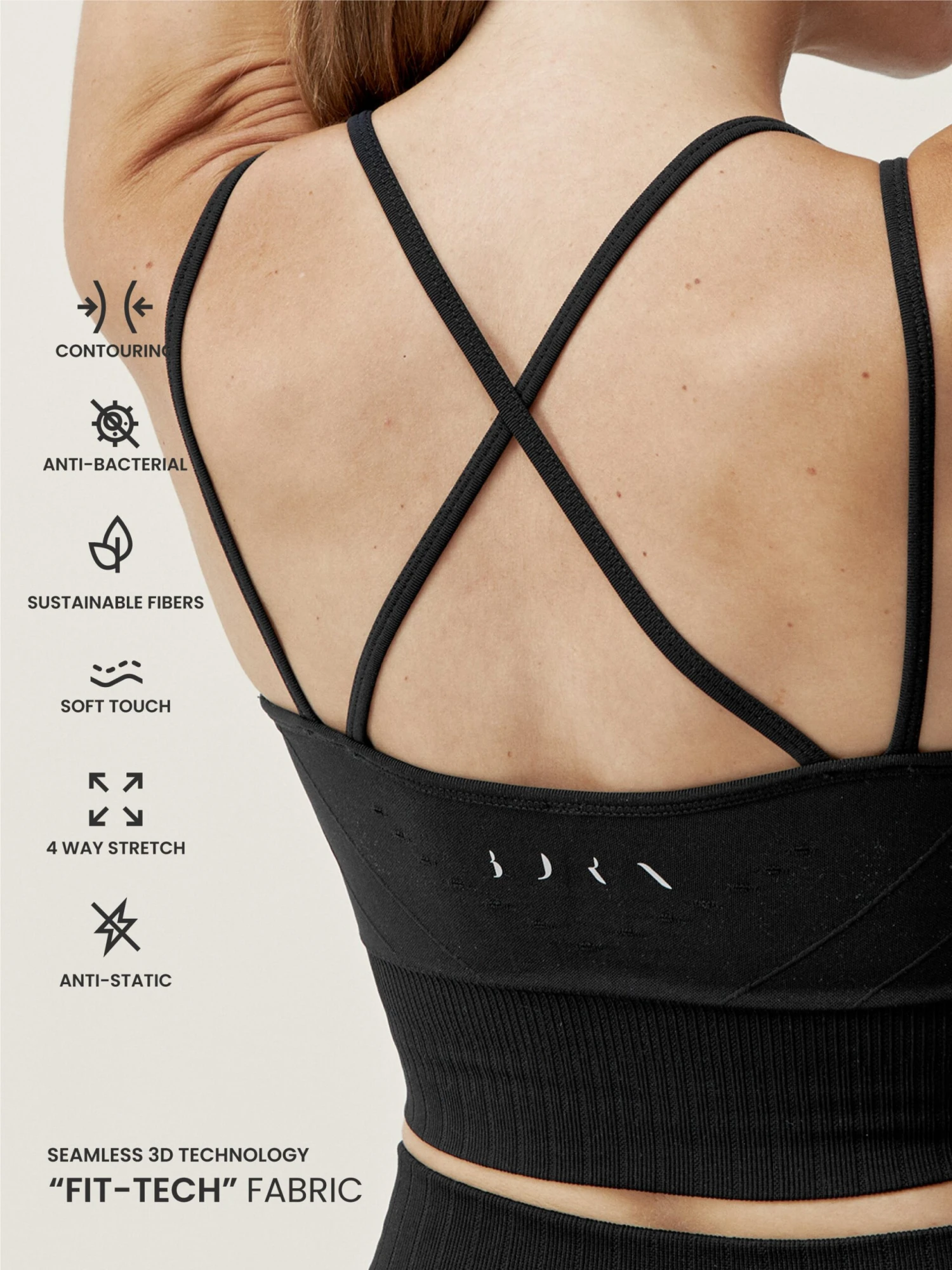 Top deportivo de sujeción media. Tejido “Fit_Tech” con tecnología 3D. Espalda con tirantes finos cruzados y motivo microperforados en la espalda para mejorar la transpirabilidad