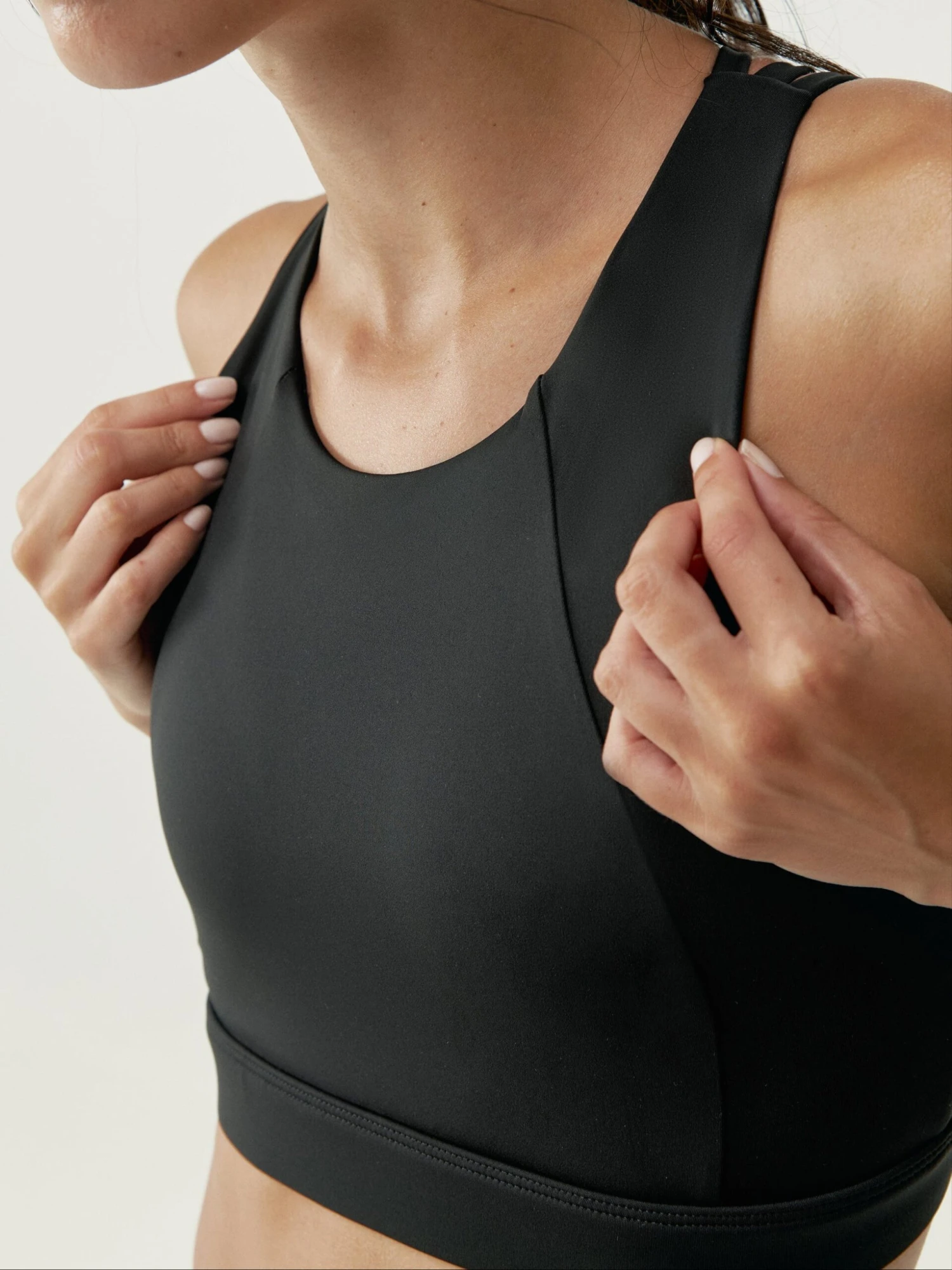 Top聽con patr贸n halter muy favorecedor, cuenta con seis tirantes cruzados creando una espalda muy elegante. Todo el top est谩 confeccionado con doble tejido para conseguir mayor sujeci贸n y costuras ocultas.