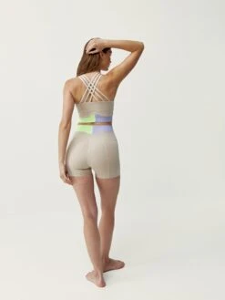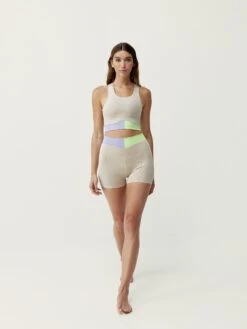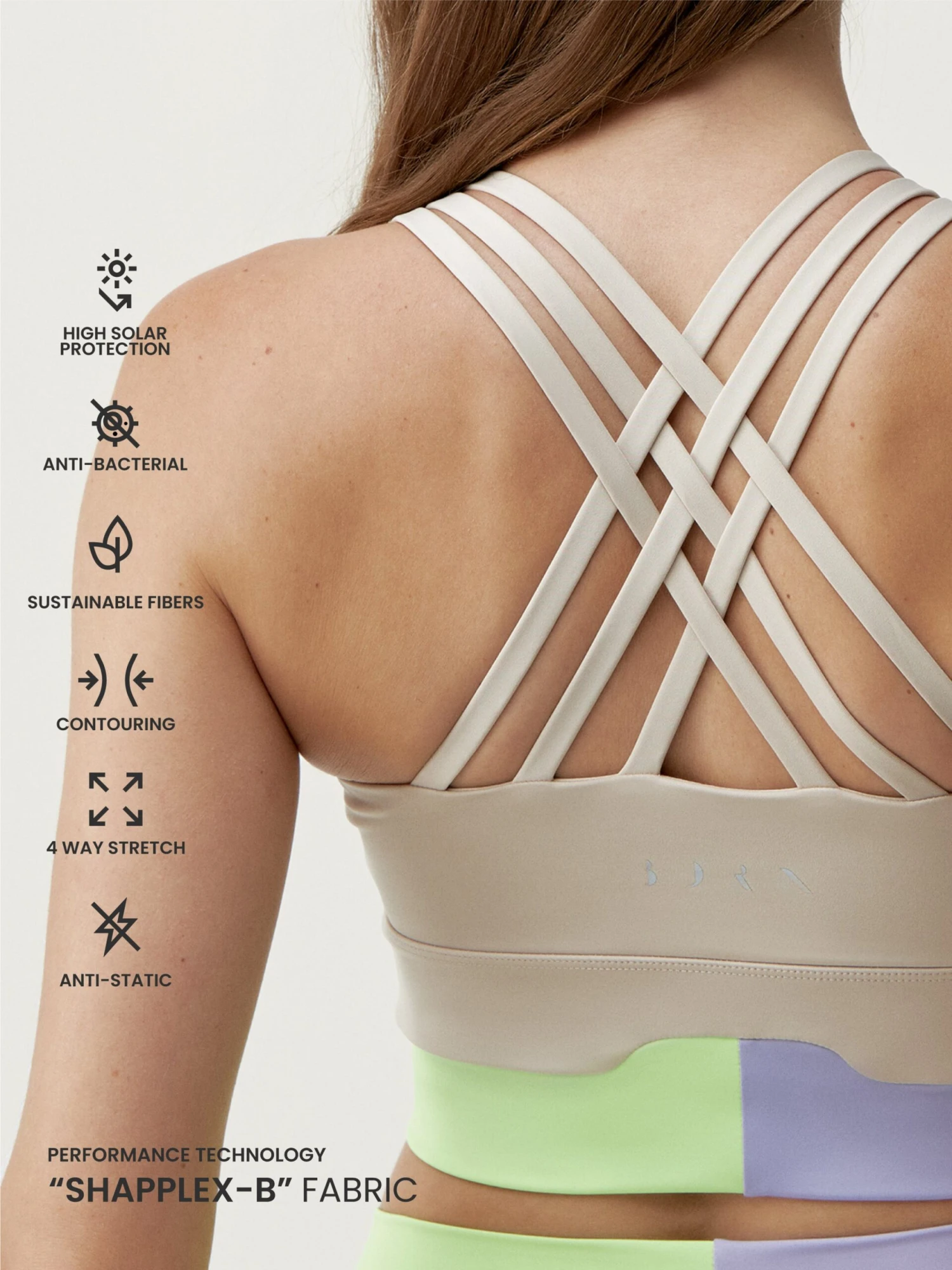 Top deportivo tricolor de sujeción media. Tejido “Shapplex_B”. Escote cuadrado y espalda con tirantes cruzados muy favorecedores.