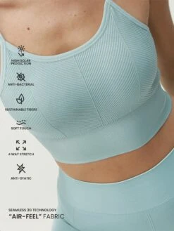 Sujetador deportivo de sujeción media. Tejido “Air_Feel”. Tecnología 3D. Tirantes finos. Top sin costuras que aporta una máxima adaptabilidad y comfort permitiendo llegar a cualquier movimiento.