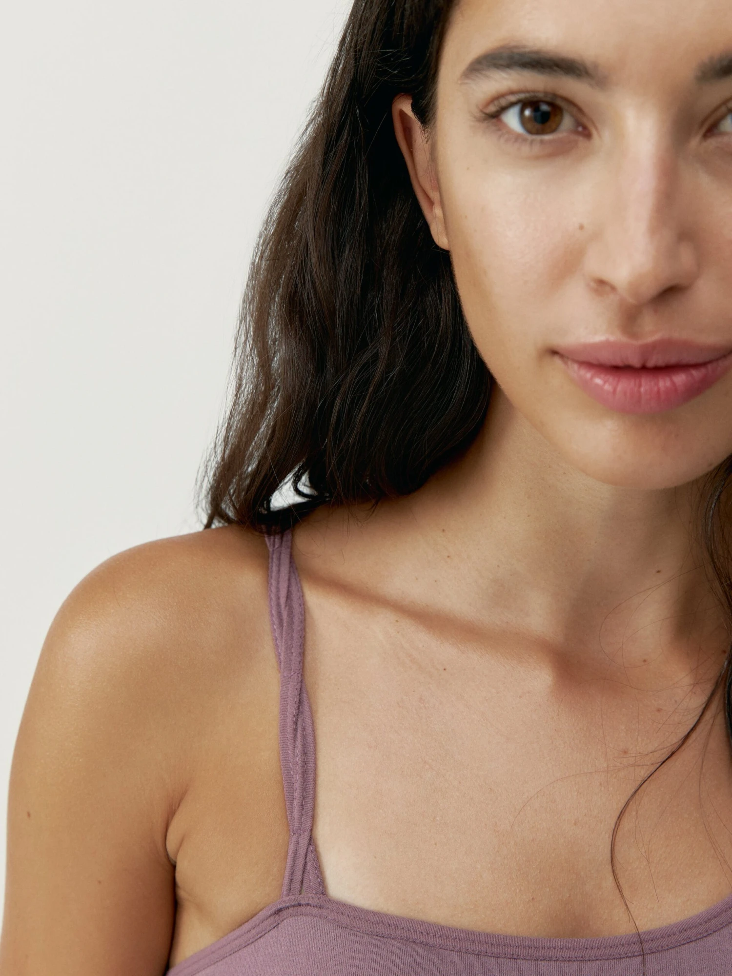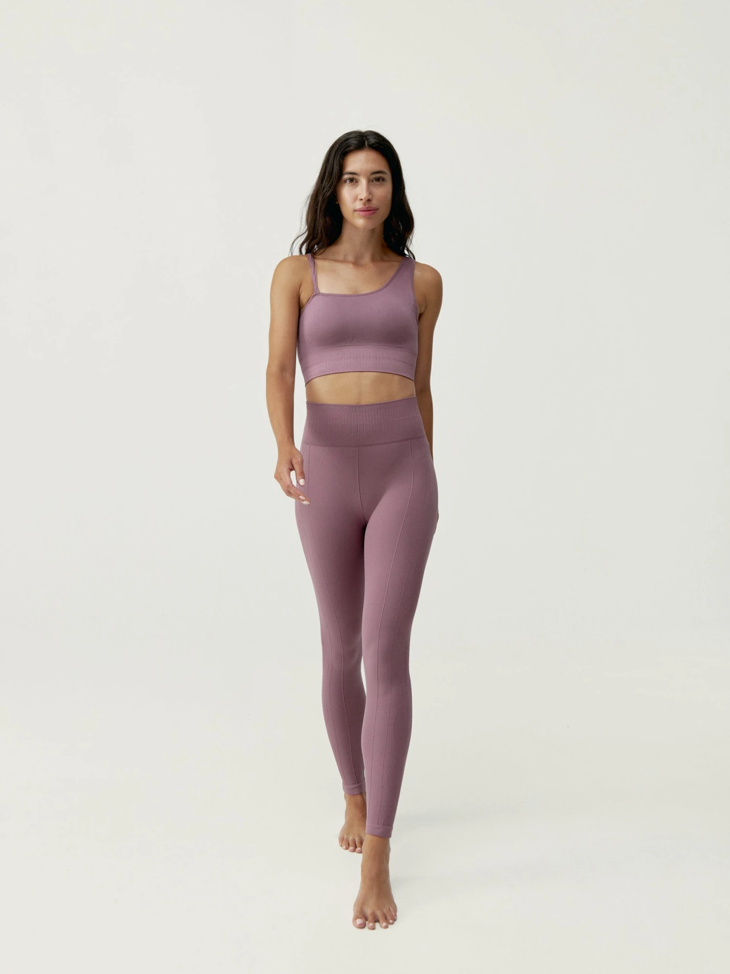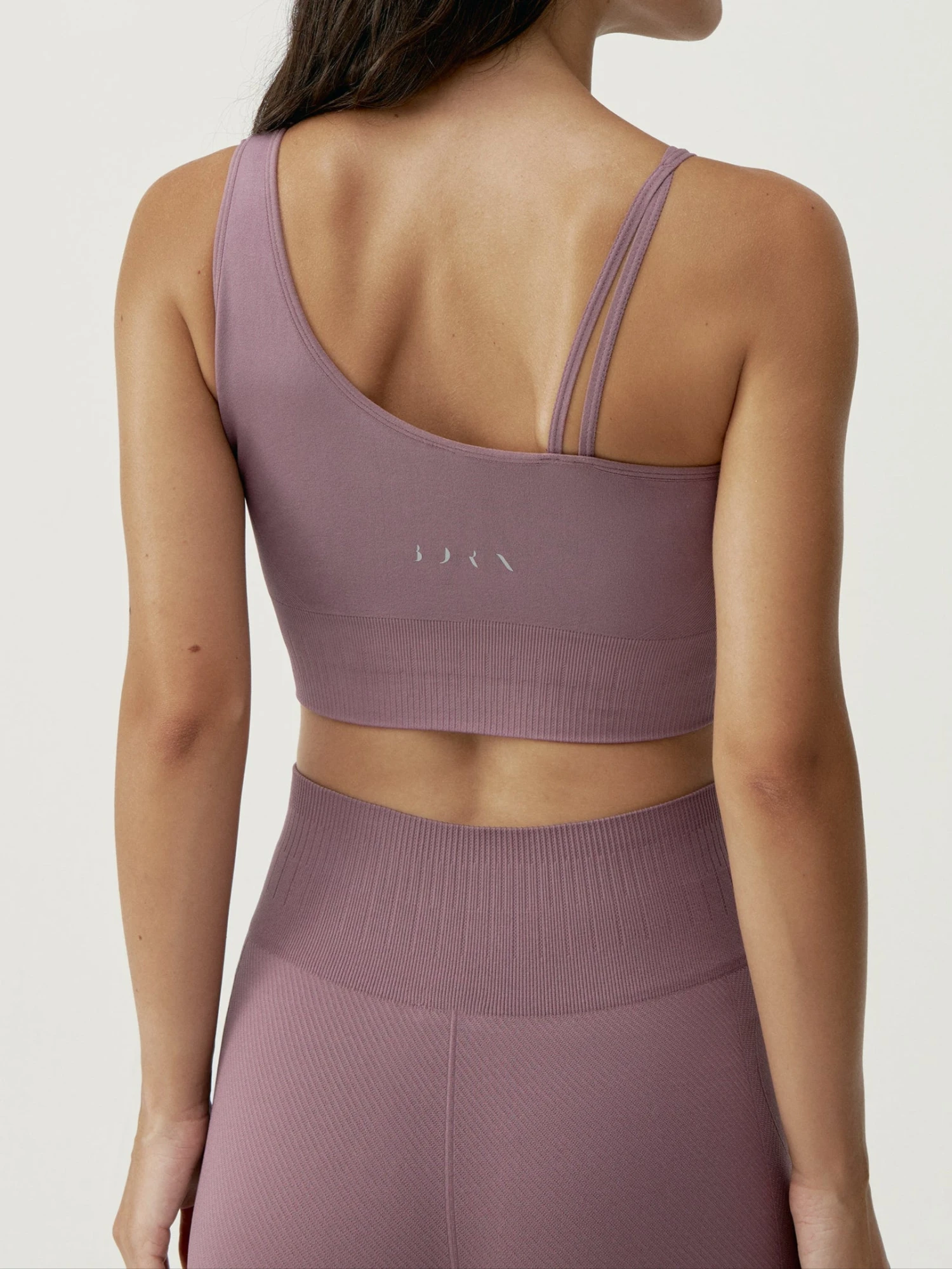 Top deportivo de sujeción media. Tejido “Fit_Tech” con tecnología Seamless 3D. Diseño asimétrico con trenza y juego de ribs en la parte inferior a juego con el legging.