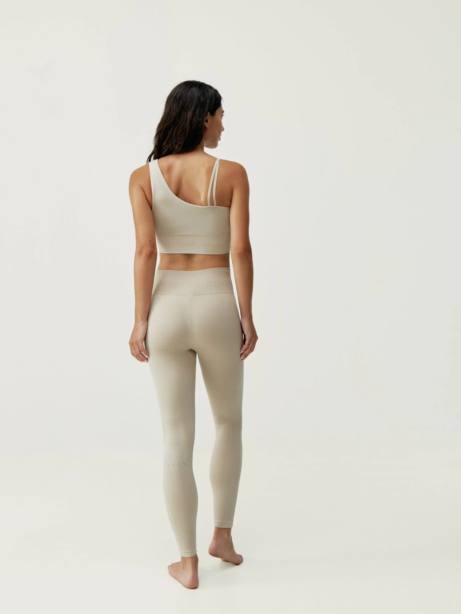 Top deportivo de sujeción media. Tejido “Fit_Tech” con tecnología Seamless 3D. Diseño asimétrico con trenza y juego de ribs en la parte inferior a juego con el legging.
