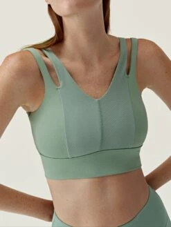 Top deportivo de sujeción media-alta con banda ancha en el bajo. Tejido Tejido “Shape_Tech” combinando con tejido en textura.
