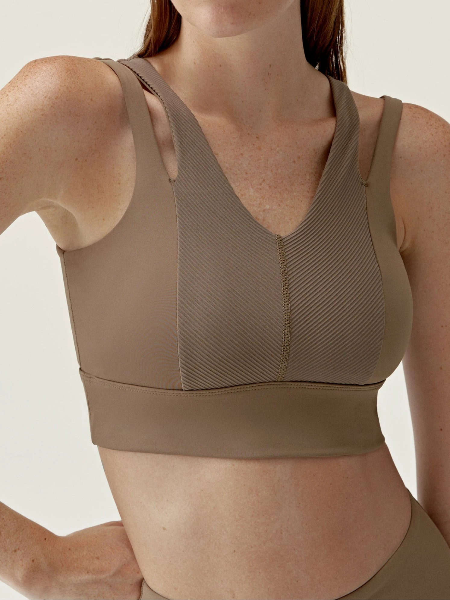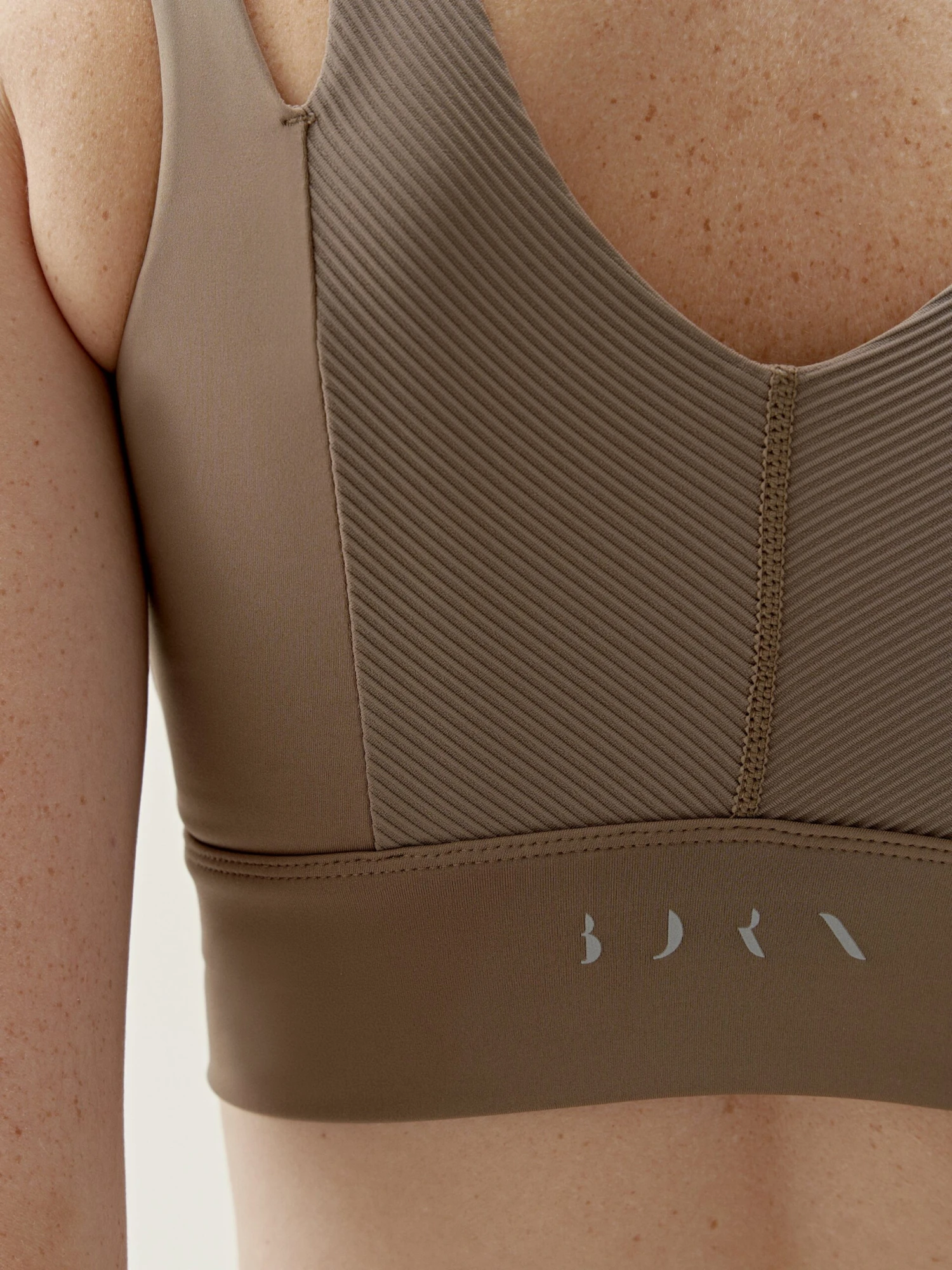 Top deportivo de sujeción media-alta con banda ancha en el bajo. Tejido “Shape_Tech” combinando con tejido en textura.