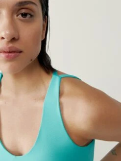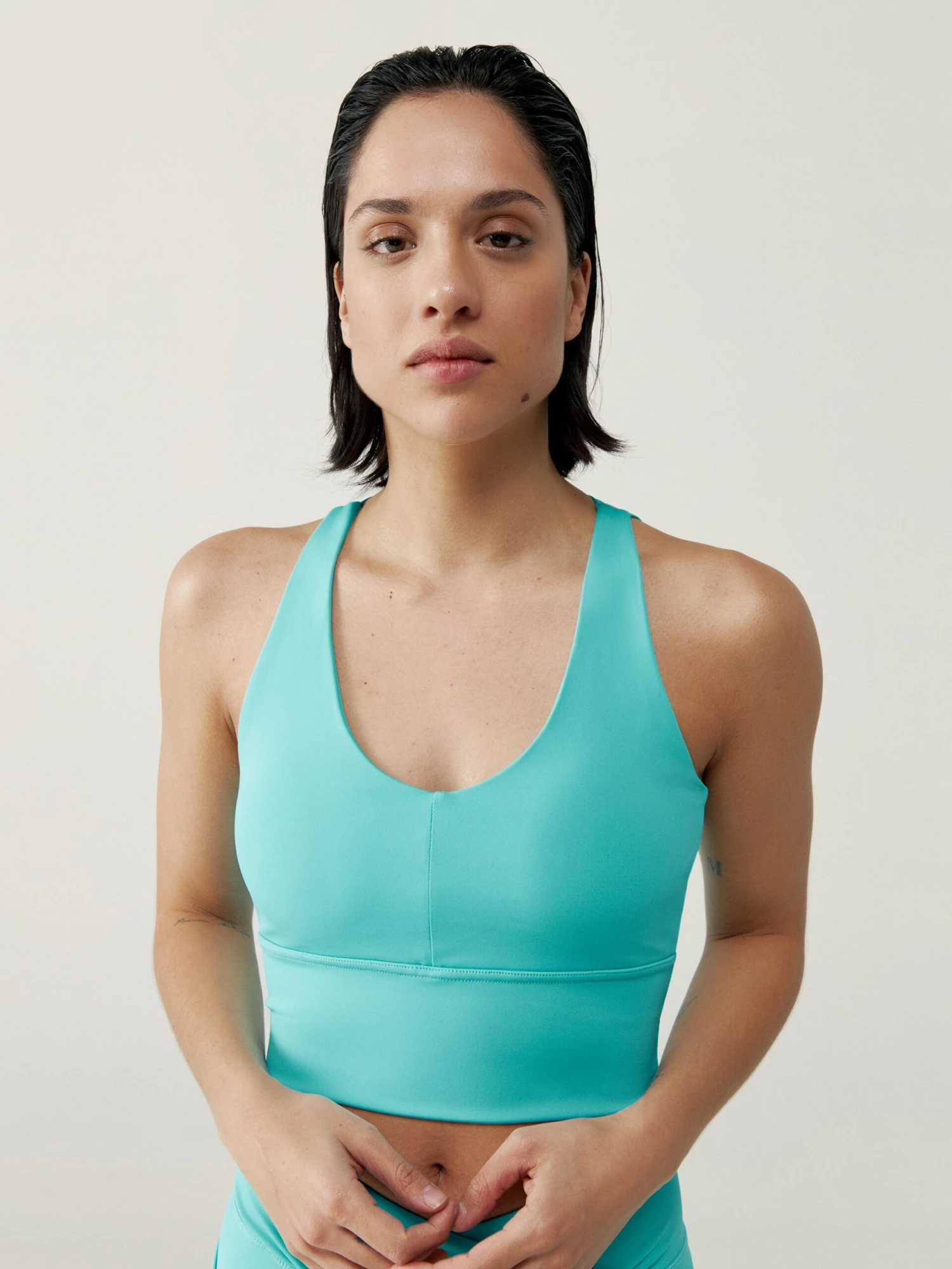 Top Cropped, con diseño sobrio y elegante de sujeción media-alta. Tejido “Skin_move”. Escote redondo Tirantes finos cruzados en la espalda.