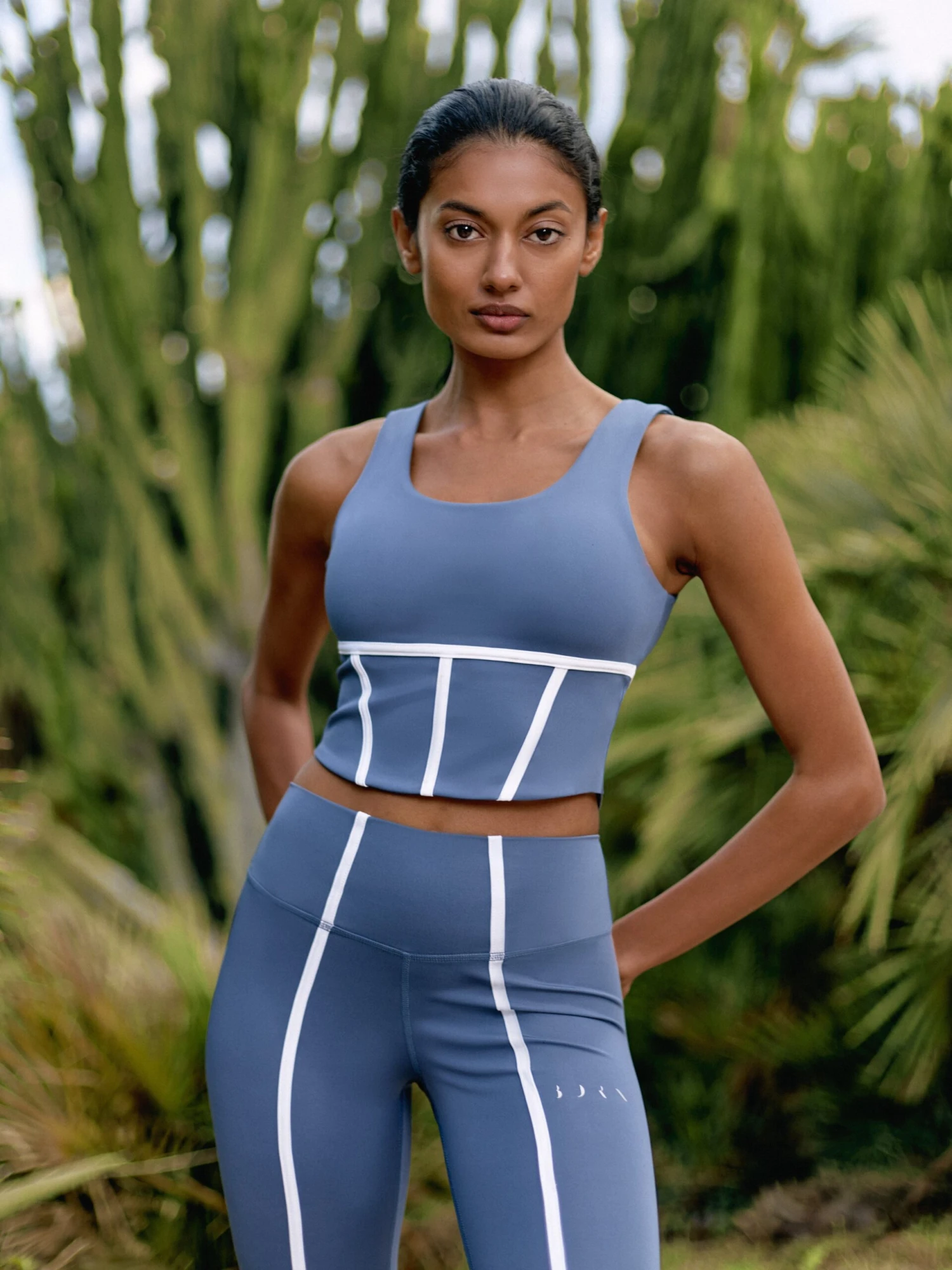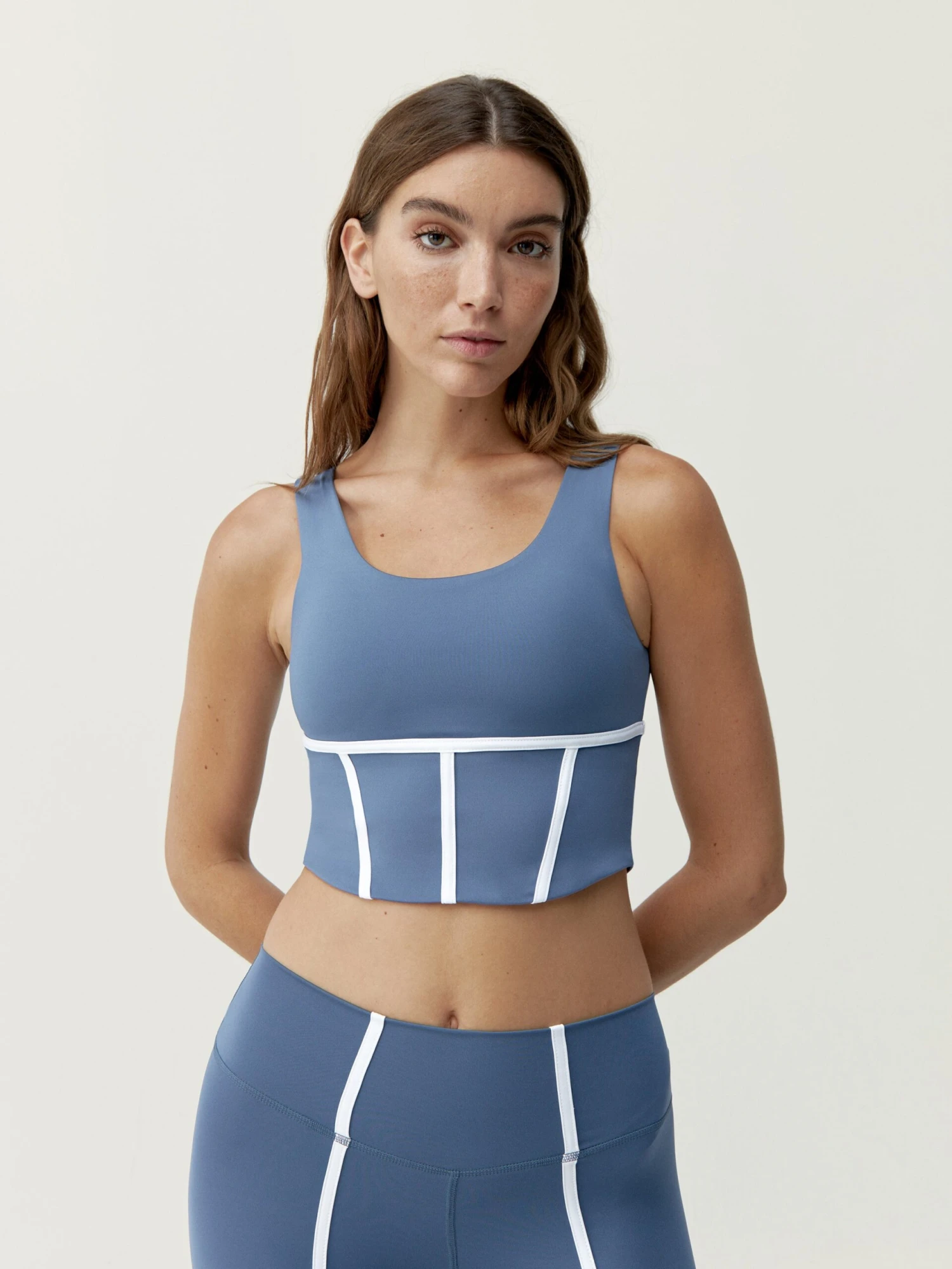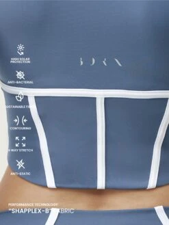 Top Cropped deportivo bicolor de sujeción media. Tejido “Shapplex_B”. Tirantes anchos y escote caja . Diseño favorecedor por sus vivos a contraste de estilo corsé, retro y sofisticado.