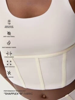 Top Cropped deportivo bicolor de sujeción media. Tejido “Shapplex_B”. Tirantes anchos y escote caja . Diseño favorecedor por sus vivos a contraste de estilo corsé, retro y sofisticado.