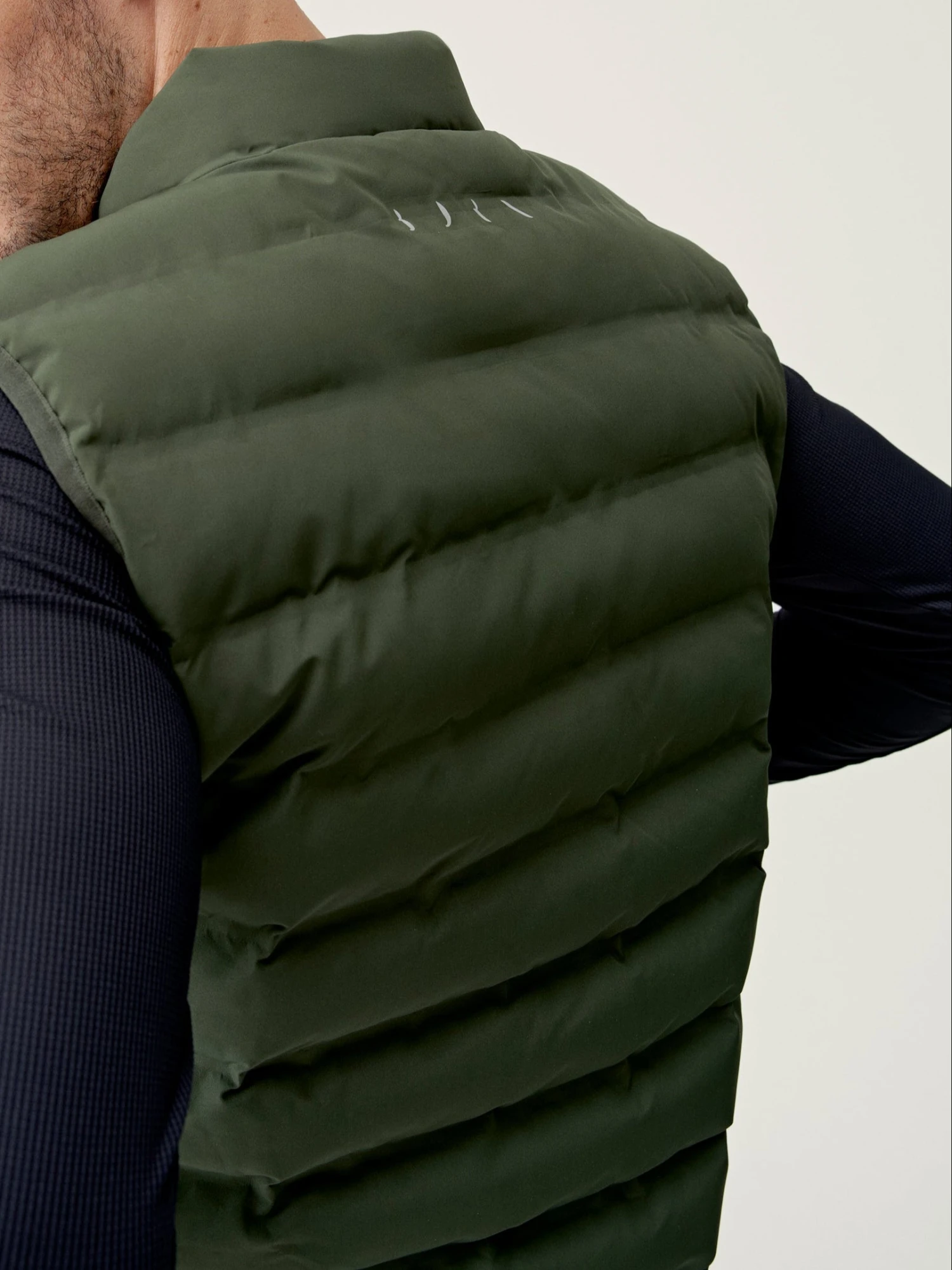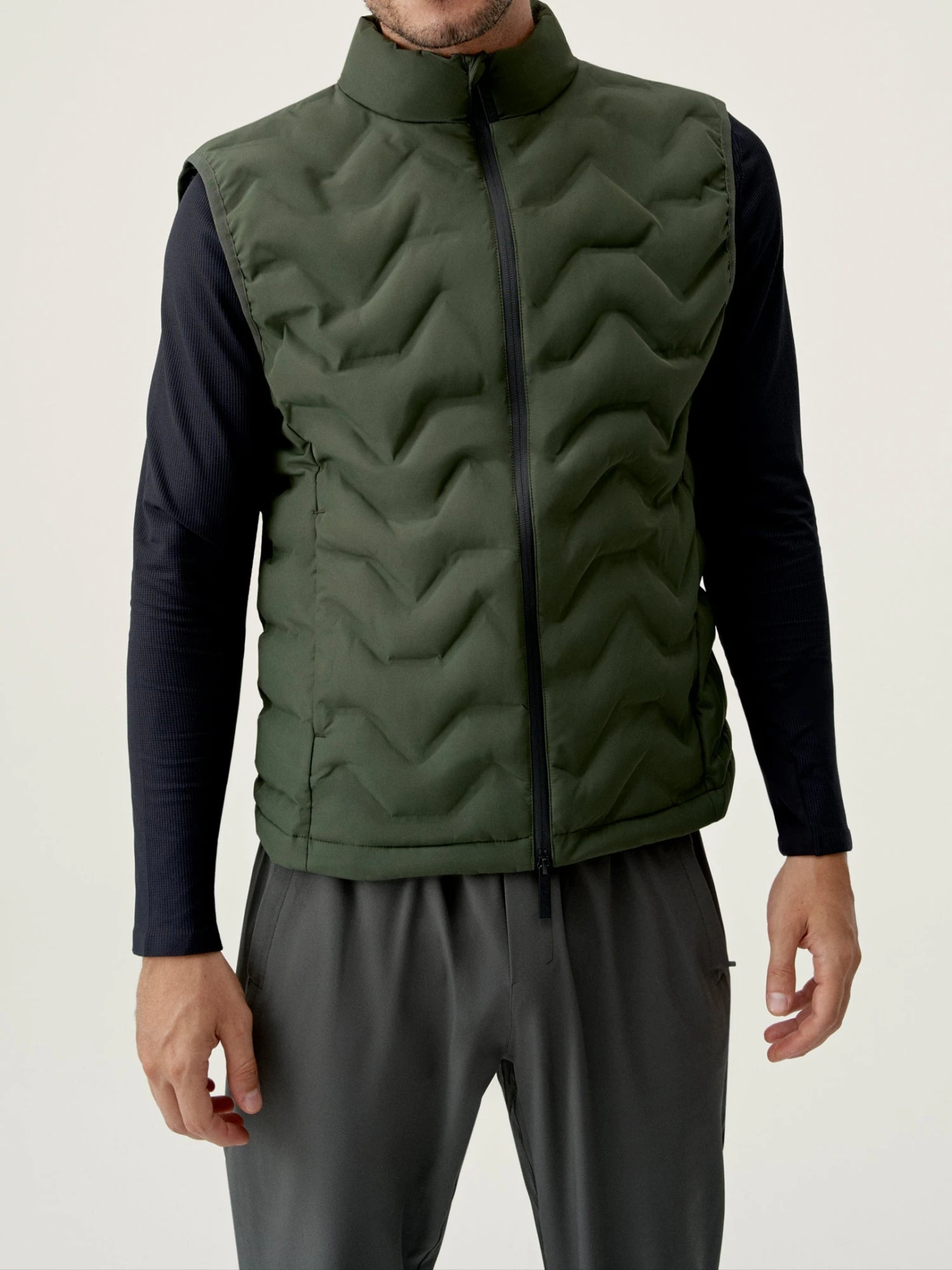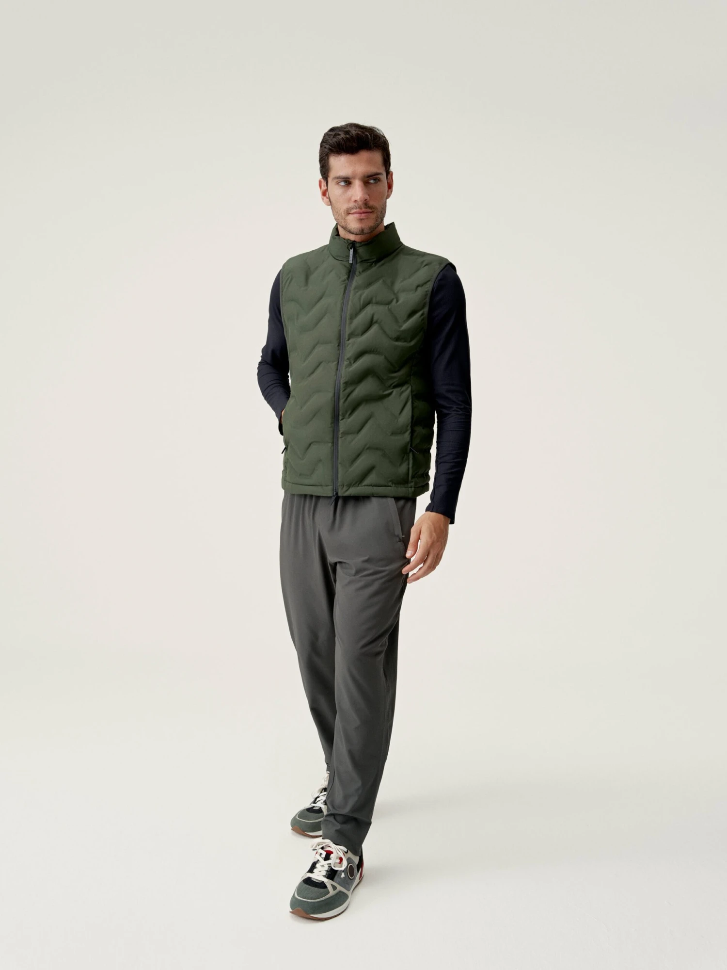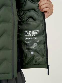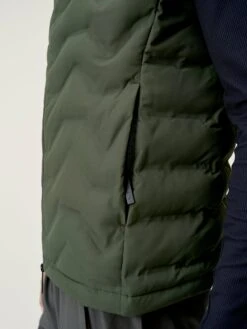 Chaleco con tejido “Hydre_T” repelente al agua (waterproof 1000mm) y al viento (windstopper) de acabado mate. Bandas acolchadas termo selladas con tecnología “heat seal”. Bolsillos laterales con cremallera oculta. Cuello gran confort. Parte trasera redondeada para cubrir mejor. Relleno vegano.